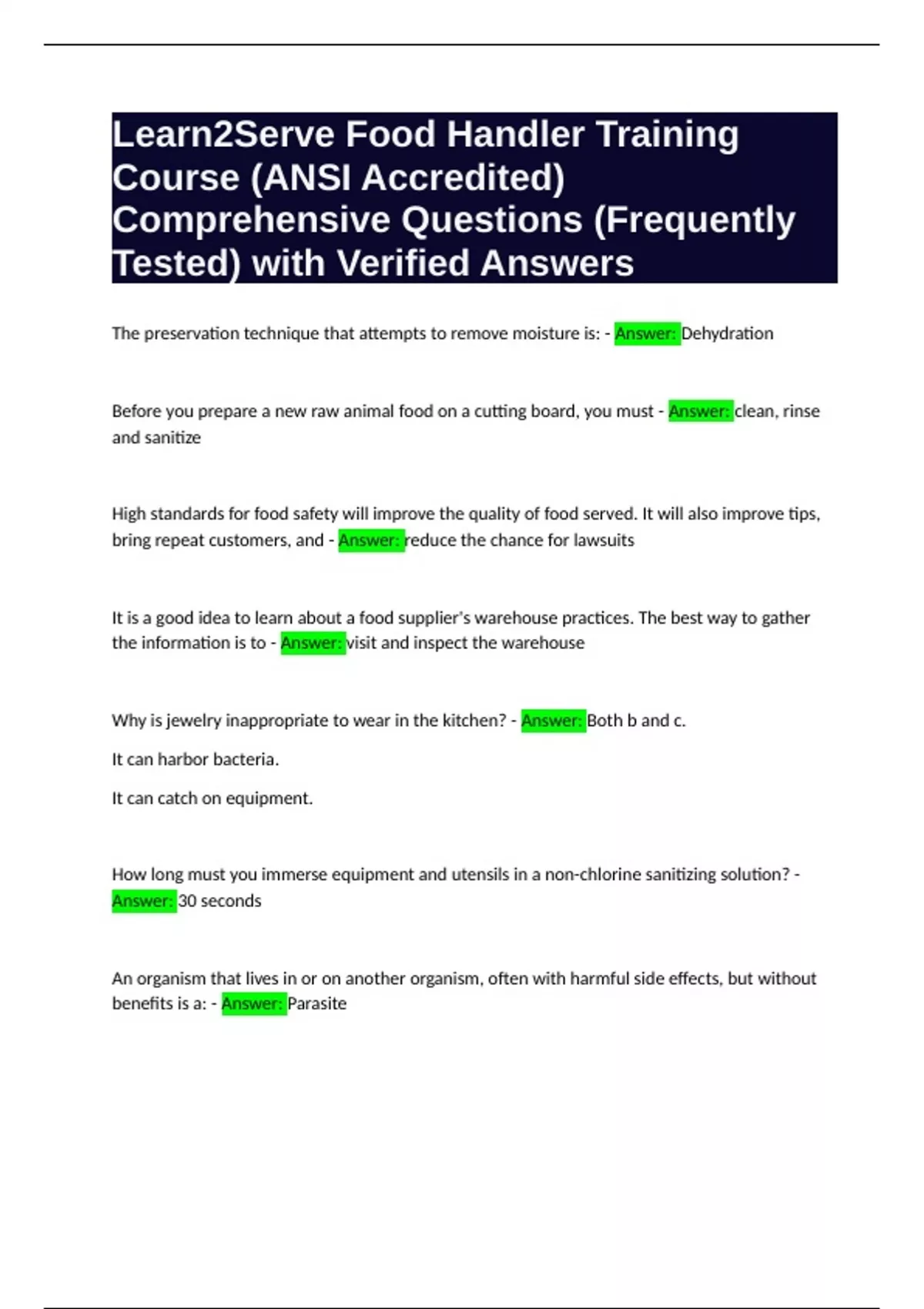 Learn2Serve Food Handler Training Course (ANSI Accredited) Comprehensive Questions (Frequently Tested) with Verified Answers