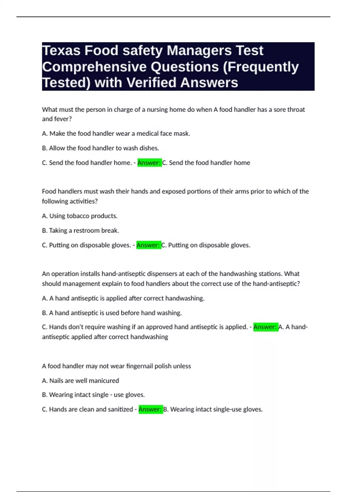 C. Send the food handler home. - Answer: C. Send the food handler home