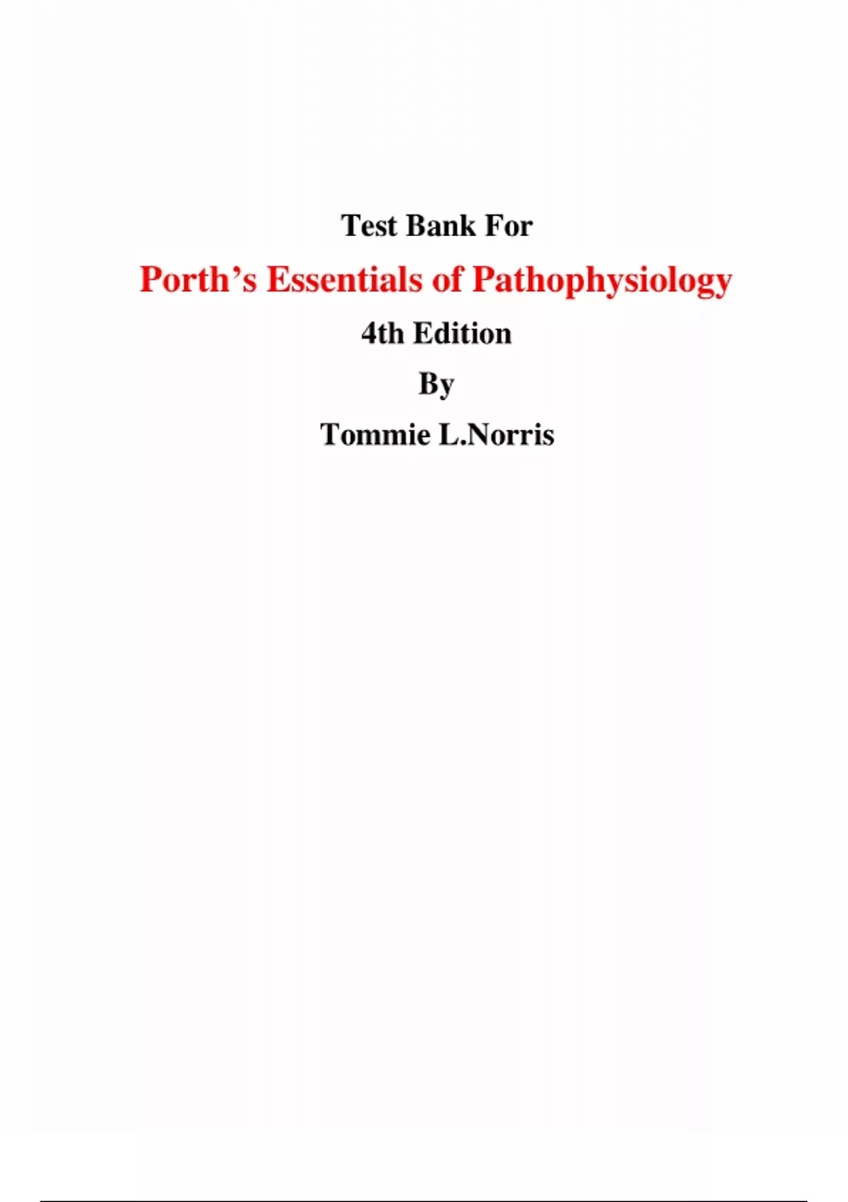 Test Bank for Essentials of Pathophysiology 4th Edition by Carol Porth (All Chapter complete 1-46, A+ Rated) Table of Contents 1 Chapter 01 - Cell Structure and Function Chapter 02 - Cellular Responses to Stress, Injury, and Aging Chapter 03 - Inflammation, the Inflammatory Response, and Fever Chapter 04 - Cell Proliferation, Tissue Regeneration, and Repair Chapter 05 - Genetic Control of Cell Function and Inheritance Chapter 06 - Genetic and Congenital Disorders Chapter 07 - Neoplasia Chapter 08 - Disorders of Fluid, Electrolyte, and Acid-Base Balance Chapter 09 - Stress and Adaptation Chapter 10 - Disorders of Nutritional Status Chapter 11 - Disorders of White Blood Cells and Lymphoid Tissues Chapter 12 - Disorders of Hemostasis Chapter 13 - Disorders of Red Blood Cells Chapter 14 - Mechanisms of Infectious Disease Chapter 15 - Innate and Adaptive Immunity Chapter 16 - Disorders of the Immune Response Chapter 17 - Control of Cardiovascular Function Chapter 18 - Disorders of Blood Flow and Blood Pressure Chapter 19 - Disorders of Cardiac Function Chapter 20 - Heart Failure and Circulatory Shock Chapter 21 - Control of Respiratory Function Chapter 22 - Respiratory Tract Infections, Neoplasms, and Childhood Disorders Chapter 23 - Disorders of Ventilation and Gas Exchange Chapter 24 - Structure and Function of the Kidney Chapter 25 - Disorders of Renal Function Chapter 26 - Acute Kidney Injury and Chronic Kidney Disease Chapter 27 - Disorders of the Bladder and Lower Urinary Tract Chapter 28 - Structure and Function of the Gastrointestinal System Chapter 29 - Disorders of Gastrointestinal Function Chapter 30 - Disorders of Hepatobiliary and Exocrine Pancreatic Function Chapter 31 - Mechanisms of Endocrine Control Chapter 32 - Disorders of Endocrine Control of Growth and Metabolism Chapter 33 - Diabetes Mellitus and the Metabolic Syndrome Chapter 34 - Organization and Control of Neural Function Chapter 35 - Somatosensory Function, Pain, and Headache Chapter 36 - Disorders of Neuromuscular Function Chapter 37 - Disorders of Brain Function Chapter 38 - Disorders of Special Sensory Function Chapter 39 - Disorders of the Male Genitourinary System Chapter 40 - Disorders of the Female Genitourinary System Chapter 41 - Sexually Transmitted Infections Chapter 42 - Structure and Function of the Skeletal System Chapter 43 - Disorders of the Skeletal System Chapter 44 - Disorders of the Skeletal System Chapter 45 - Structure and Function of the Integumentum Chapter 46 - Disorders of Skin Integrity and Function 294 Chapter 01 - Cell Structure and Function 1. The nucleus , which is essential for function and survival of the cell. A) is the site of protein synthesis B) contains the genetic code C) transforms cellular energy D) initiates aerobic metabolism 2. Although energy is not made in mitochondria, they are known as the power plants of the cell because they: A) contain RNA for protein synthesis. B) utilize glycolysis for oxidative energy. C) extract energy from organic compounds. D) store calcium bonds for muscle contractions. 3. Although the basic structure of the cell plasma membrane is formed by a lipid bilayer, most of the specific membrane functions are carried out by: A) bound and transmembrane proteins. B) complex, long carbohydrate chains. C) surface antigens and hormone receptors. D) a gating system of selective ion channels. 4. To effectively relay signals, cell-to-cell communication utilizes chemical messenger systems that: A) displace surface receptor proteins. B) accumulate within cell gap junctions. C) bind to contractile microfilaments. D) release secretionsinto extracellular fluid. 5. Aerobic metabolism, also known as oxidative metabolism, provides energy by: A) removing the phosphate bonds from ATP. B) combining hydrogen and oxygen to form water. C) activating pyruvate stored in the cytoplasm. D) breaking down glucose to form lactic acid. 6. Exocytosis, the reverse of endocytosis, isimportant in into the extracellular fluid. A) Engulfing and ingesting fluid and proteins for transport B) Killing, degrading, and dissolving harmful microorganisms C) Removing cellular debris and releasing synthesized substances D) Destruction of particles by lysosomal enzymes for secretion 7. The processresponsible for generating and conducting membrane potentials is: A) diffusion of current-carrying ions. B) millivoltage of electrical potential. C) polarization of charged particles. D) ion channel neurotransmission. 8. Epithelial tissues are classified according to the shape of the cells and the number of layers. Which of the following is a correctly matched description and type of epithelial tissue? A) Simple epithelium: cells in contact with intercellular matrix; some do not extend to surface B) Stratified epithelium: single layer of cells; all cells rest on basement membrane C) Glandular epithelium: arise from surface epithelia and underlying connective tissue D) Pseudostratified epithelium: multiple layers of cells; deepest layer rests on basement membrane 9. Connective tissue contains fibroblasts that are responsible for: A) providing a fibrous framework for capillaries. B) synthesis of collagen, elastin, and reticular fibers. C) forming tendons and the fascia that covers muscles. D) filling spaces between tissuesto keep organs in place. 10. Although all muscle tissue cells have some similarities, smooth muscle (also known as involuntary muscle) differs by: A) having dense bodies attached to actin filaments. B) containing sarcomeres between Z lines and M bands. C) having rapid contractions and abundant cross-striations. D) contracting in response to increased intracellular calcium. 11. Which of the following aspects of the function of the nucleus is performed by ribosomal RNA (rRNA)? A) Copying and carrying DNA instructions for protein synthesis B) Carrying amino acids to the site of protein synthesis C) Providing the site where protein synthesis occurs D) Regulating and controlling protein synthes