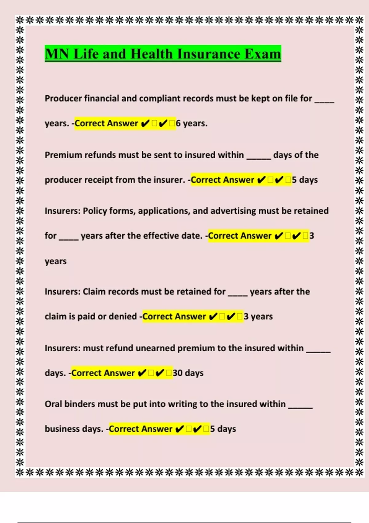Producer financial and compliant records must be kept on file for ____ years. -Correct Answer 6 years. Premium refunds must be sent to insured within _____ days of the producer receipt from the insurer. -Correct Answer 5 days Insurers: Policy forms, applications, and advertising must be retained for ____ years after the effective date. -Correct Answer 3 years Insurers: Claim records must be retained for ____ years after the claim is paid or denied -Correct Answer 3 years Insurers: must refund unearned premium to the insured within _____ days. -Correct Answer 30 days Oral binders must be put into writing to the insured within _____ business days. -Correct Answer 5 days