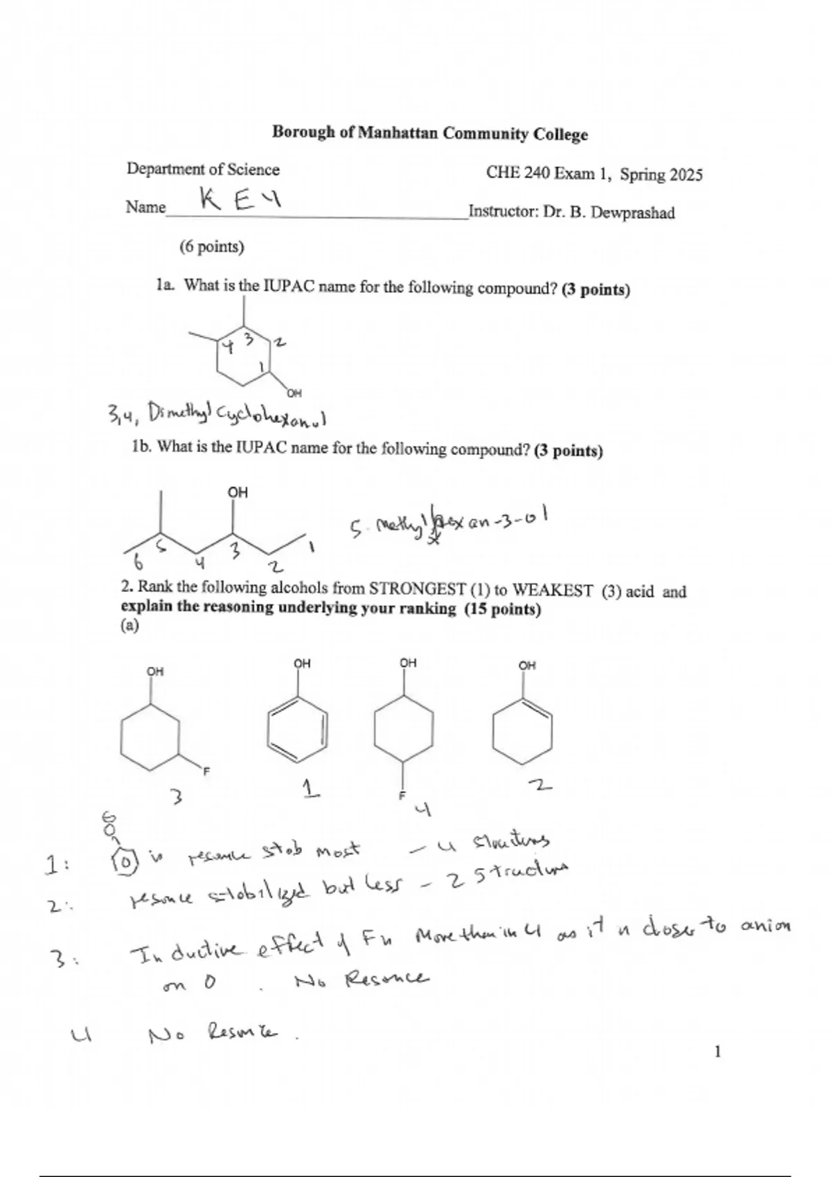 Department of Science CHE 240 Exam 1, Spring 2025