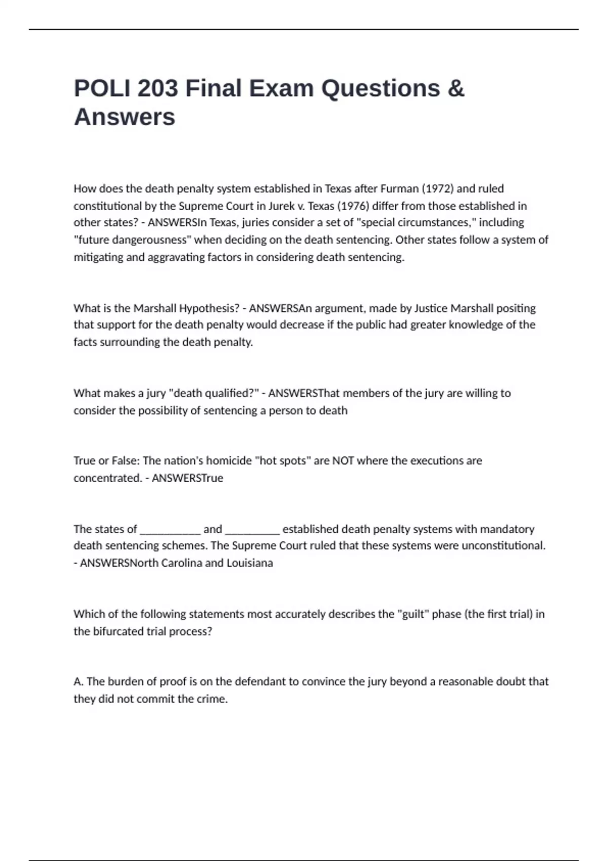 POLI 203 Final Exam Questions & Answers How does the death penalty system established in Texas after Furman (1972) and ruled constitutional by the Supreme Court in Jurek v. Texas (1976) differ from those established in other states? - ANSWERSIn Texas, juries consider a set of "special circumstances," including "future dangerousness" when deciding on the death sentencing. Other states follow a system of mitigating and aggravating factors in considering death sentencing. What is the Marshall Hypothesis? - ANSWERSAn argument, made by Justice Marshall positing that support for the death penalty would decrease if the public had greater knowledge of the facts surrounding the death penalty. What makes a jury "death qualified?" - ANSWERSThat members of the jury are willing to consider the possibility of sentencing a person to death True or False: The nation's homicide "hot spots" are NOT where the executions are concentrated. - ANSWERSTrue The states of __________ and _________ established death penalty systems with mandatory death sentencing schemes. The Supreme Court ruled that these systems were unconstitutional. - ANSWERSNorth Carolina and Louisiana Which of the following statements most accurately describes the "guilt" phase (the first trial) in the bifurcated trial process? A. The burden of proof is on the defendant to convince the jury beyond a reasonable doubt that they did not commit the crime.