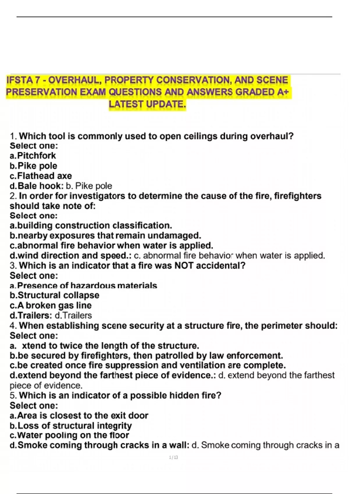 IFSTA 7 - OVERHAUL, PROPERTY CONSERVATION, AND SCENE PRESERVATION EXAM QUESTIONS AND ANSWERS GRADED A+ LATEST UPDATE. IFSTA 7 exam questions Overhaul quiz answers Property conservation study guide Scene preservation practice test Fire service exam prep Latest IFSTA 7 questions IFSTA 7 graded answers Property conservation questions Overhaul exam prep Scene preservation questions Firefighter exam updates IFSTA 7 study materials Exam questions for IFSTA 7 Fire service training exams Property conservation exam tips Scene preservation exam practice IFSTA 7 latest update Graded A+ exam answers Overhaul exam questions Fire scene preservation study Property conservation test prep IFSTA 7 practice exams Fire service exam guides Overhaul scene preservation test Firefighter exam questions Study guide for IFSTA 7 IFSTA fire exam practice Updated property conservation questions Graded fire service exams