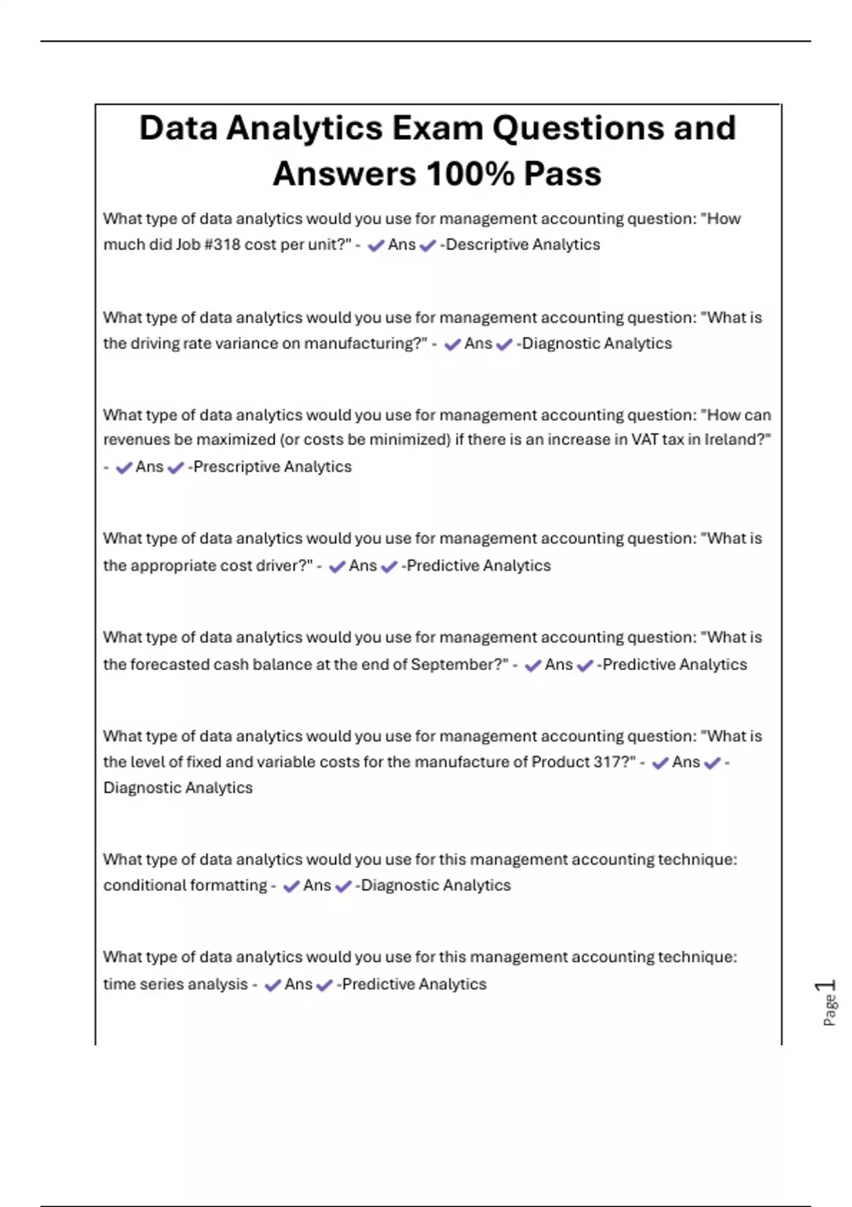 Data Analytics Exam Questions and Answers 100% Pass What type of data analytics would you use for management accounting question: "How much did Job #318 cost per unit?" - Ans -Descriptive Analytics What type of data analytics would you use for management accounting question: "What is the driving rate variance on manufacturing?" - Ans -Diagnostic Analytics What type of data analytics would you use for management accounting question: "How can revenues be maximized (or costs be minimized) if there is an increase in VAT tax in Ireland?" - Ans -Prescriptive Analytics What type of data analytics would you use for management accounting question: "What is the appropriate cost driver?" - Ans -Predictive Analytics What type of data analytics would you use for management accounting question: "What is the forecasted cash balance at the end of September?" - Ans -Predictive Analytics What type of data analytics would you use for management accounting question: "What is the level of fixed and variable costs for the manufacture of Product 317?" - Ans - Diagnostic A