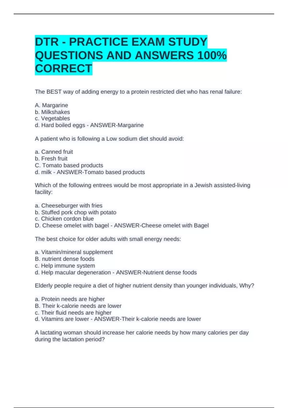 DTR - PRACTICE EXAM STUDY QUESTIONS AND ANSWERS 100% CORRECTDTR - PRACTICE EXAM STUDY QUESTIONS AND ANSWERS 100% CORRECTDTR - PRACTICE EXAM STUDY QUESTIONS AND ANSWERS 100% CORRECT The BEST way of adding energy to a protein restricted diet who has renal failure: A. Margarine b. Milkshakes c. Vegetables d. Hard boiled eggs - ANSWER-Margarine A patient who is following a Low sodium diet should avoid: a. Canned fruit b. Fresh fruit C. Tomato based products d. milk - ANSWER-Tomato based products Which of the following entrees would be most appropriate in a Jewish assisted-living facility: a. Cheeseburger with fries b. Stuffed pork chop with potato c. Chicken cordon blue D. Cheese omelet with bagel - ANSWER-Cheese omelet with Bagel The best choice for older adults with small energy needs: a. Vitamin/mineral supplement