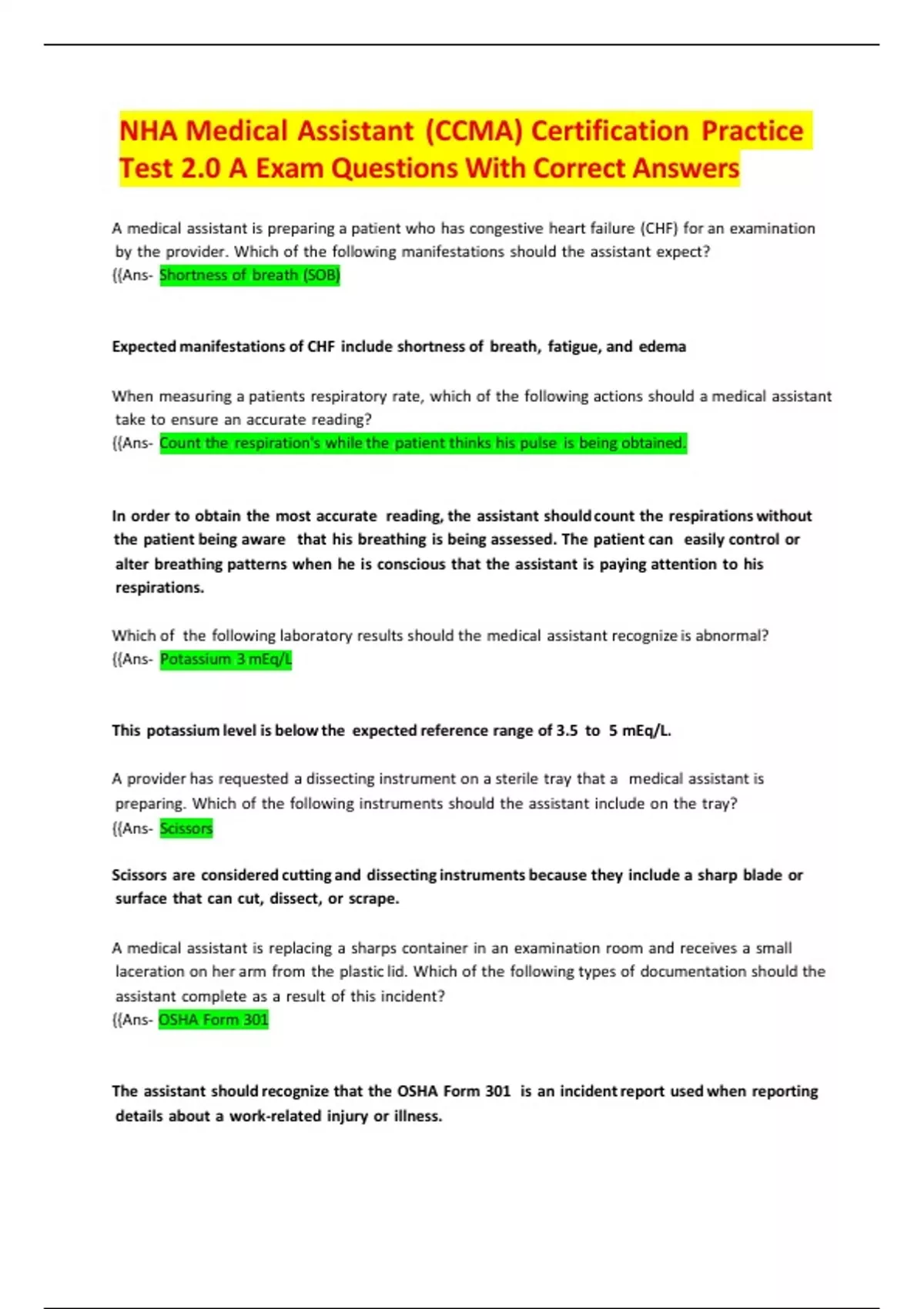 NHA Medical Assistant (CCMA) Certification Practice Test 2.0 A Exam Questions With Correct Answers