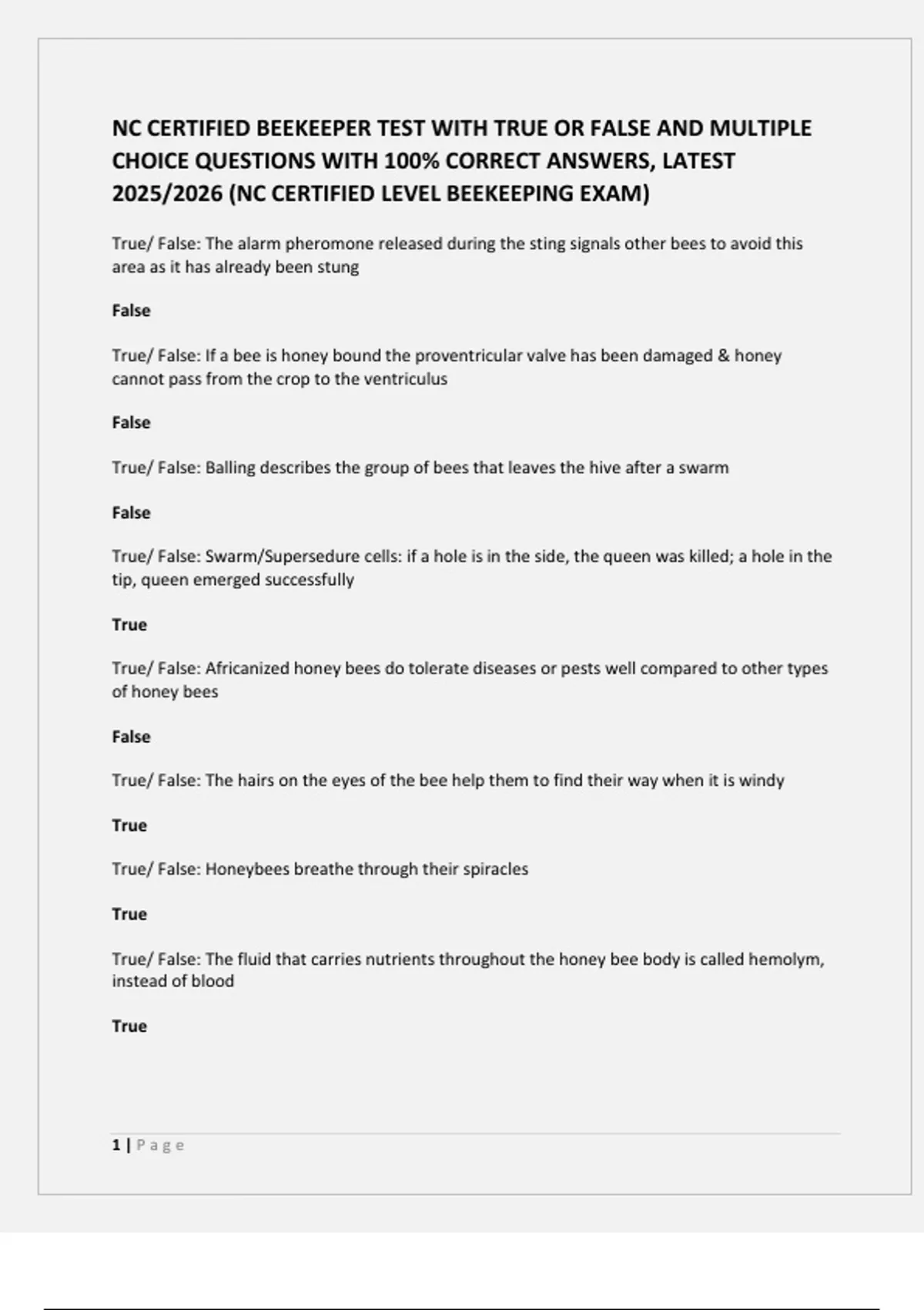 NC CERTIFIED BEEKEEPER TEST WITH TRUE OR FALSE AND MULTIPLE