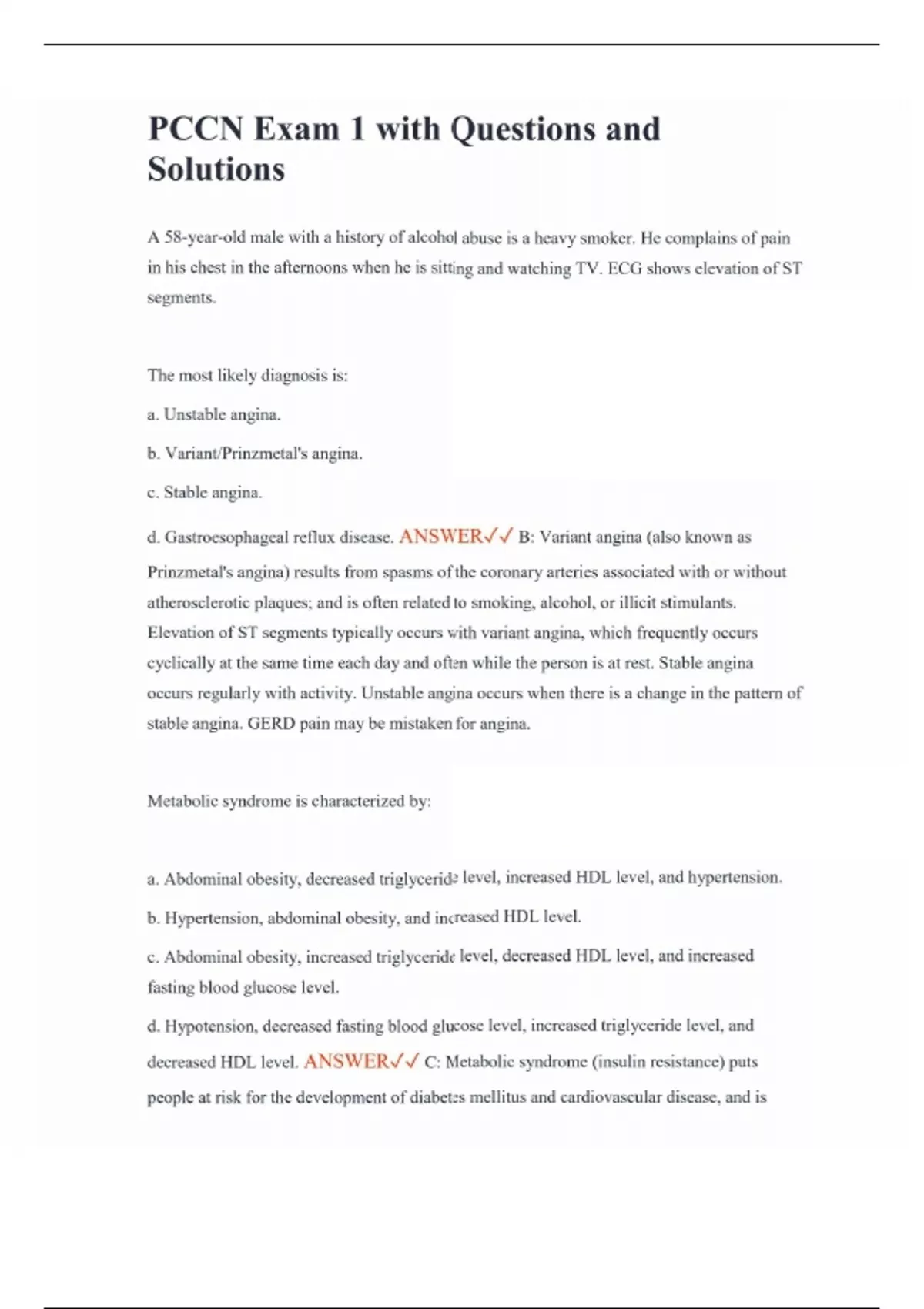 PCCN Exam 1 with Questions and Solutions A 58-year-old male with a history of alcohol abuse is a heavy smoker. He complains of pain in his chest in the afternoons when he is sitting and watching TV. ECG shows elevation of ST segments. The most likely diagnosis is: a. Unstable angina. b. Variant/Prinzmetal's angina. c. Stable angina. d. Gastroesophageal reflux disease. ANSWER B: Variant angina (also known as Prinzmetal's angina) results from spasms of the coronary arteries associated with or without atherosclerotic plaques; and is often related to smoking, alcohol, or illicit stimulants. Elevation of ST segments typically occurs with variant angina, which frequently occurs cyclically at the same time each day and often while the person is at rest. Stable angina occurs regularly with activity. Unstable angina occurs when there is a change in the pattern of stable angina. GERD pain may be mistaken for angina. Metabolic syndrome is characterized by: a. Abdominal obesity, decreased triglyceride level, increased HDL level, and hypertension. b. Hypertension, abdominal obesity, and increased HDL level. c. Abdominal obesity, increased triglyceride level, decreased HDL level, and increased fasting blood glucose level. d. Hypotension, decreased fasting blood glucose level, increased triglyceride level, and decreased HDL level. ANSWER C: Metabolic syndrome (insulin resistance) puts people at risk for the development of diabetes mellitus and cardiovascular disease, and is