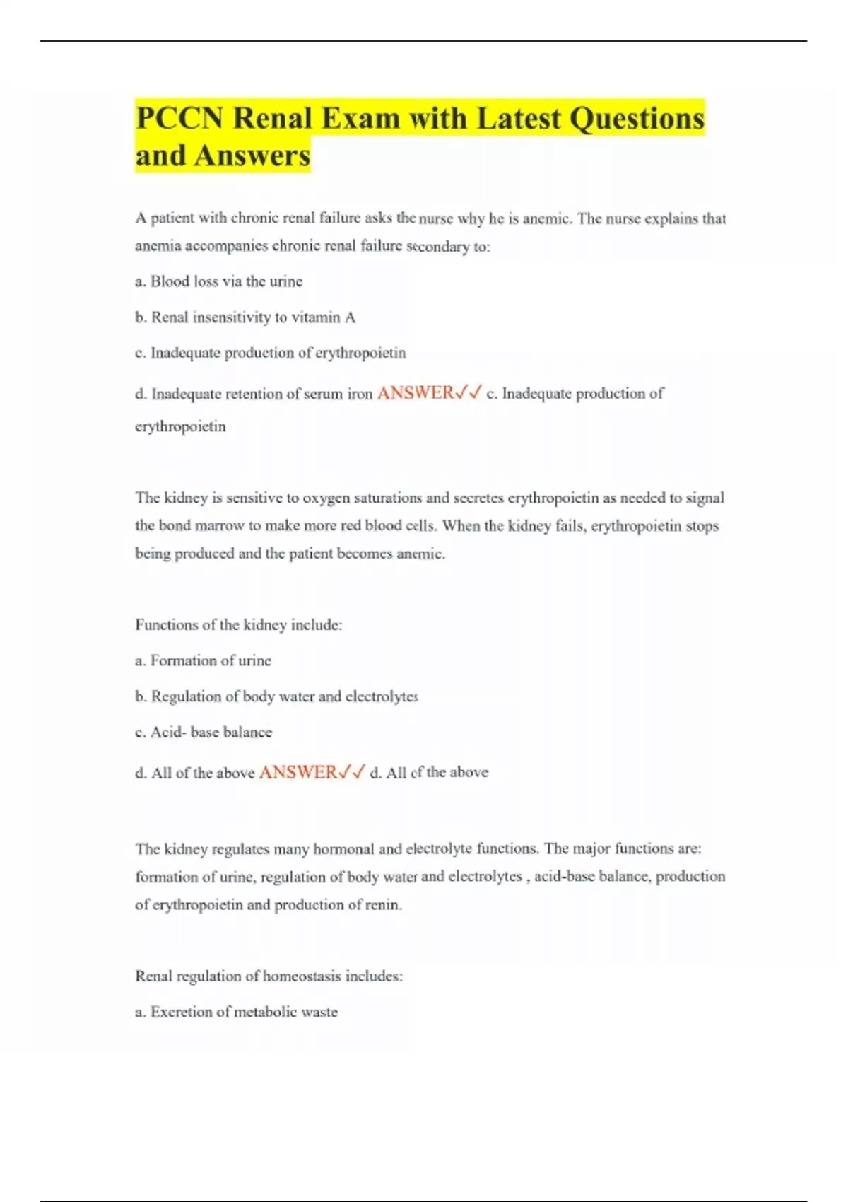 PCCN Renal Exam with Latest Questions and Answers A patient with chronic renal failure asks the nurse why he is anemic. The nurse explains that anemia accompanies chronic renal failure secondary to: a. Blood loss via the urine b. Renal insensitivity to vitamin A c. Inadequate production of erythropoietin d. Inadequate retention of serum iron ANSWER c. Inadequate production of erythropoietin The kidney is sensitive to oxygen saturations and secretes erythropoietin as needed to signal the bond marrow to make more red blood cells. When the kidney fails, erythropoietin stops being produced and the patient becomes anemic. Functions of the kidney include: a. Formation of urine b. Regulation of body water and electrolytes c. Acid- base balance d. All of the above ANSWER d. All of the above The kidney regulates many hormonal and electrolyte functions. The major functions are: formation of urine, regulation of body water and electrolytes , acid-base balance, production of erythropoietin and production of renin. Renal regulation of homeostasis includes: a. Excretion of metabolic waste