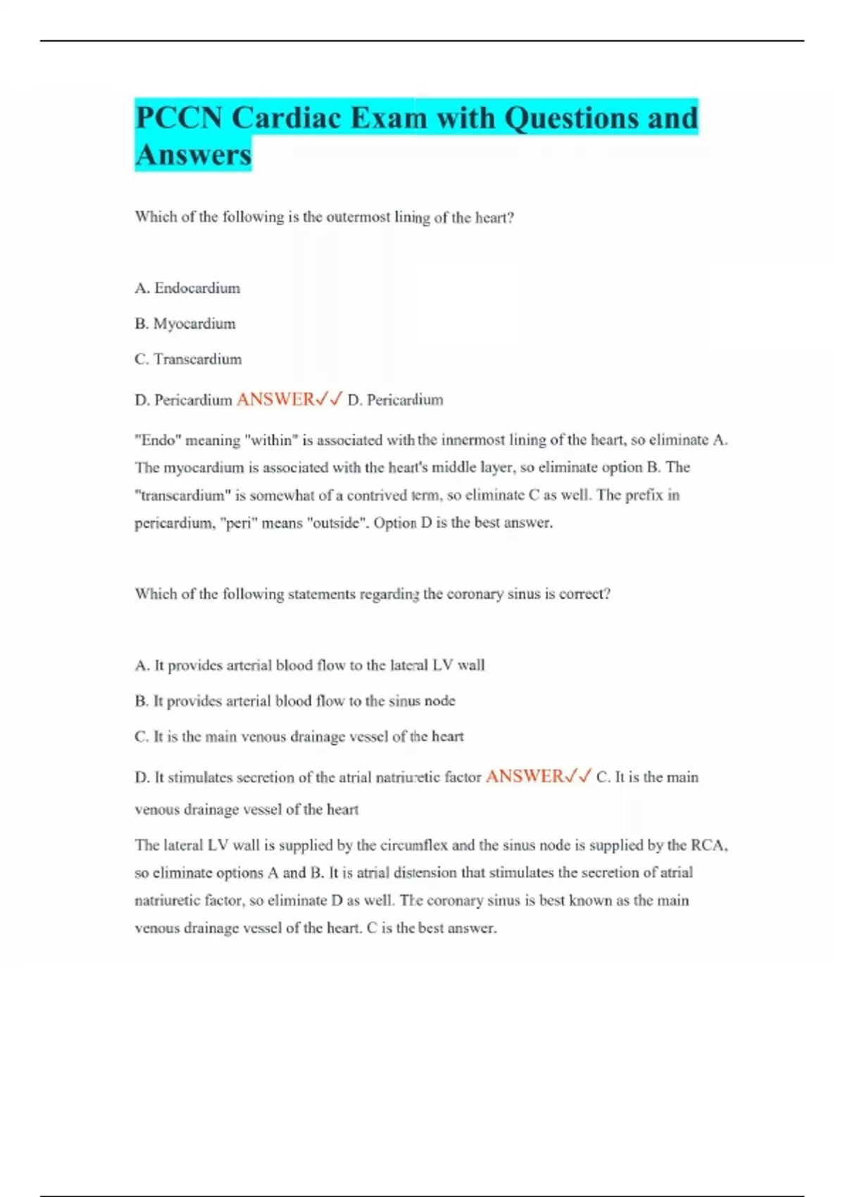PCCN Cardiac Exam with Questions and Answers Which of the following is the outermost lining of the heart? A. Endocardium B. Myocardium C. Transcardium D. Pericardium ANSWER D. Pericardium "Endo" meaning "within" is associated with the innermost lining of the heart, so eliminate A. The myocardium is associated with the heart's middle layer, so eliminate option B. The "transcardium" is somewhat of a contrived term, so eliminate C as well. The prefix in pericardium, "peri" means "outside". Option D is the best answer. Which of the following statements regarding the coronary sinus is correct? A. It provides arterial blood flow to the lateral LV wall B. It provides arterial blood flow to the sinus node C. It is the main venous drainage vessel of the heart D. It stimulates secretion of the atrial natriuretic factor ANSWER C. It is the main venous drainage vessel of the heart The lateral LV wall is supplied by the circumflex and the sinus node is supplied by the RCA, so eliminate options A and B. It is atrial distension that stimulates the secretion of atrial natriuretic factor, so eliminate D as well. The coronary sinus is best known as the main venous drainage vessel of the heart. C is the best answer.