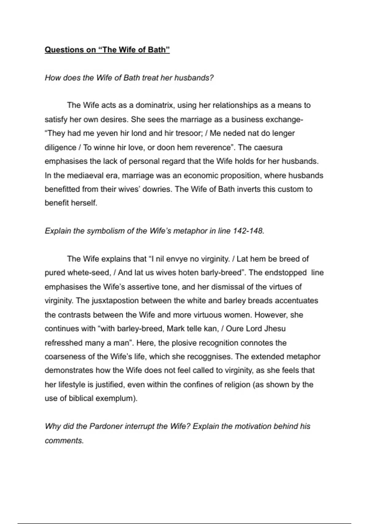 emphasises the Wife’s assertive tone, and her dismissal of the virtues of