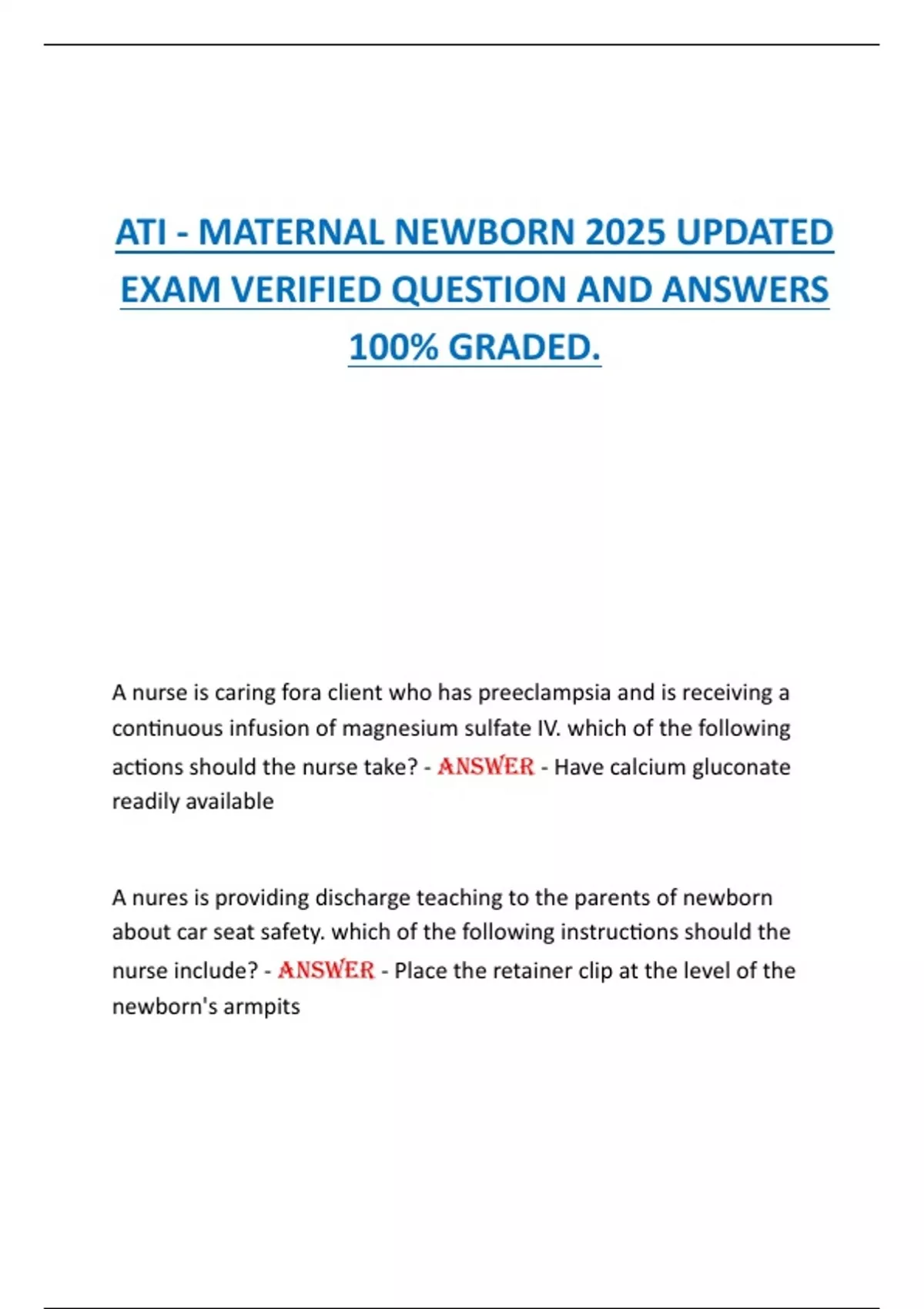 ATI - MATERNAL NEWBORN 2025 UPDATED EXAM VERIFIED QUESTION AND ANSWERS 100% GRADED.