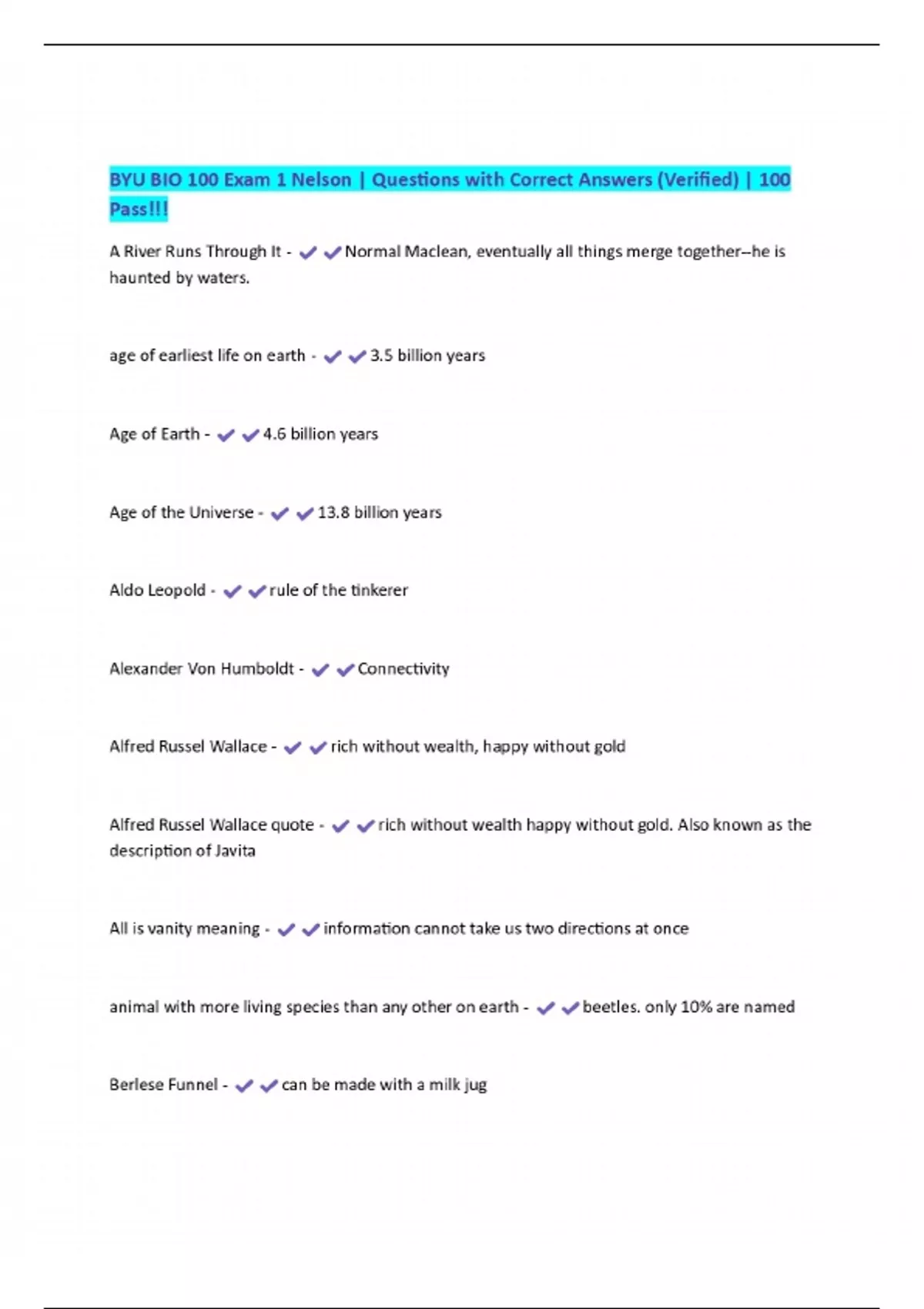 BYU BIO 100 Exam 1 Nelson | Questions with Correct Answers (Verified) | 100 Pass!!!