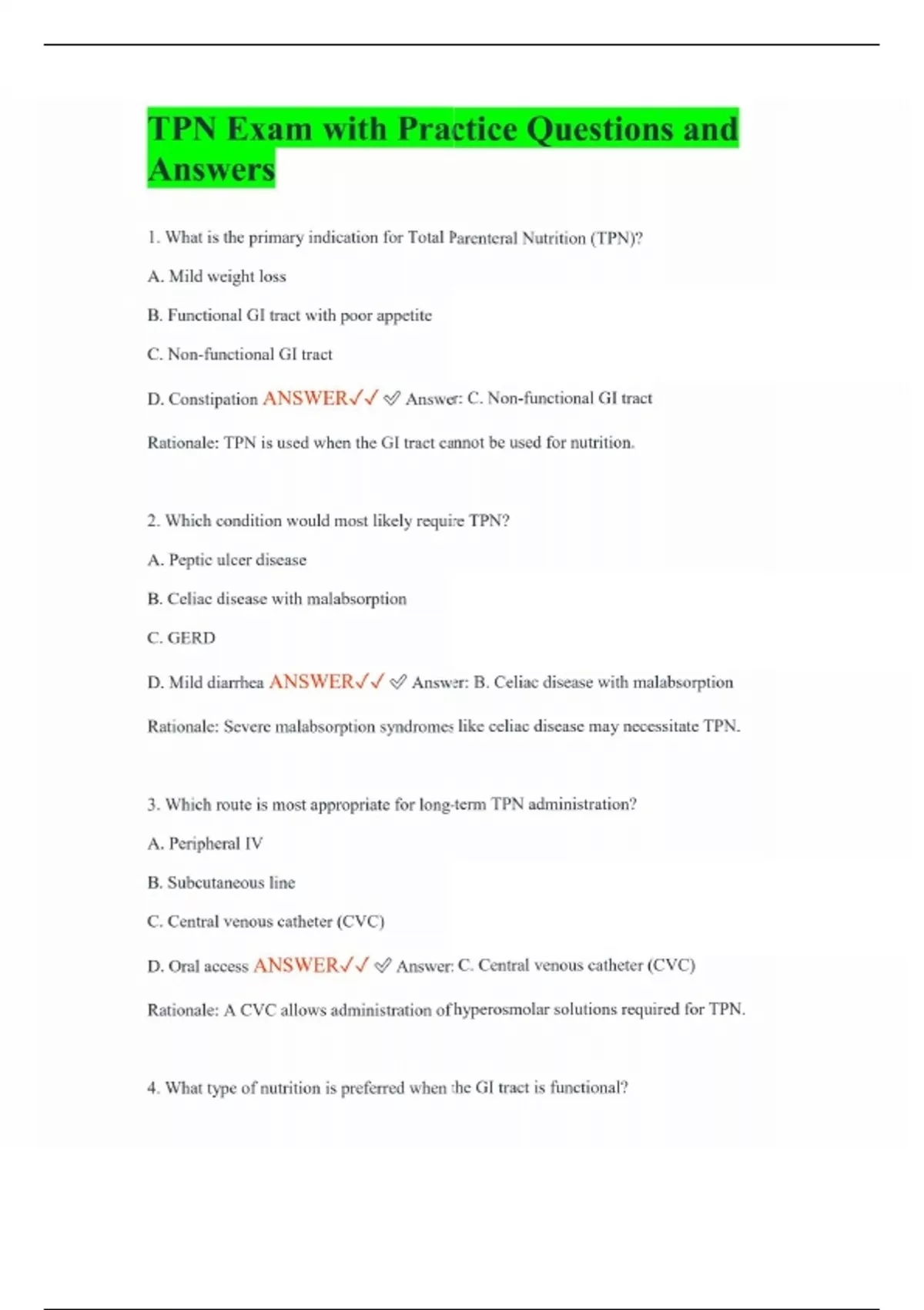 TPN Exam with Practice Questions and Answers 1. What is the primary indication for Total Parenteral Nutrition (TPN)? A. Mild weight loss B. Functional GI tract with poor appetite C. Non-functional GI tract D. Constipation ANSWER Answer: C. Non-functional GI tract Rationale: TPN is used when the GI tract cannot be used for nutrition. 2. Which condition would most likely require TPN? A. Peptic ulcer disease B. Celiac disease with malabsorption C. GERD D. Mild diarrhea ANSWER Answer: B. Celiac disease with malabsorption Rationale: Severe malabsorption syndromes like celiac disease may necessitate TPN. 3. Which route is most appropriate for long-term TPN administration? A. Peripheral IV B. Subcutaneous line C. Central venous catheter (CVC) D. Oral access ANSWER Answer: C. Central venous catheter (CVC) Rationale: A CVC allows administration of hyperosmolar solutions required for TPN. 4. What type of nutrition is preferred when the GI tract is functional?