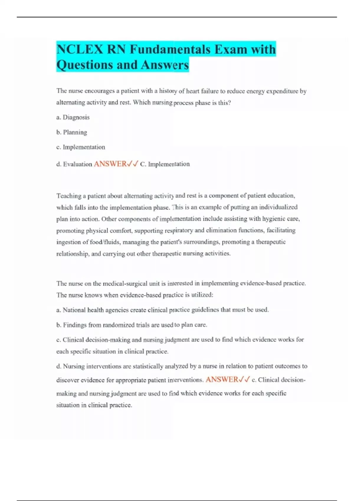 NCLEX RN Fundamentals Exam with Questions and Answers The nurse encourages a patient with a history of heart failure to reduce energy expenditure by alternating activity and rest. Which nursing process phase is this? a. Diagnosis b. Planning c. Implementation d. Evaluation ANSWER C. Implementation Teaching a patient about alternating activity and rest is a component of patient education, which falls into the implementation phase. This is an example of putting an individualized plan into action. Other components of implementation include assisting with hygienic care, promoting physical comfort, supporting respiratory and elimination functions, facilitating ingestion of food/fluids, managing the patient's surroundings, promoting a therapeutic relationship, and carrying out other therapeutic nursing activities. The nurse on the medical-surgical unit is interested in implementing evidence-based practice. The nurse knows when evidence-based practice is utilized: a. National health agencies create clinical practice guidelines that must be used. b. Findings from randomized trials are used to plan care. c. Clinical decision-making and nursing judgment are used to find which evidence works for each specific situation in clinical practice. d. Nursing interventions are statistically analyzed by a nurse in relation to patient outcomes to discover evidence for appropriate patient interventions. ANSWER c. Clinical decision-making and nursing judgment are used to find which evidence works for each specific situation in clinical practice.