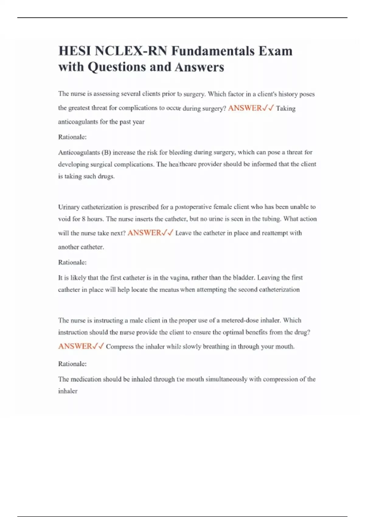 HESI NCLEX-RN Fundamentals Exam with Questions and Answers The nurse is assessing several clients prior to surgery. Which factor in a client's history poses the greatest threat for complications to occur during surgery? ANSWER Taking anticoagulants for the past year Rationale: Anticoagulants (B) increase the risk for bleeding during surgery, which can pose a threat for developing surgical complications. The healthcare provider should be informed that the client is taking such drugs. Urinary catheterization is prescribed for a postoperative female client who has been unable to void for 8 hours. The nurse inserts the catheter, but no urine is seen in the tubing. What action will the nurse take next? ANSWER Leave the catheter in place and reattempt with another catheter. Rationale: It is likely that the first catheter is in the vagina, rather than the bladder. Leaving the first catheter in place will help locate the meatus when attempting the second catheterization The nurse is instructing a male client in the proper use of a metered-dose inhaler. Which instruction should the nurse provide the client to ensure the optimal benefits from the drug? ANSWER Compress the inhaler while slowly breathing in through your mouth. Rationale: The medication should be inhaled through the mouth simultaneously with compression of the inhaler