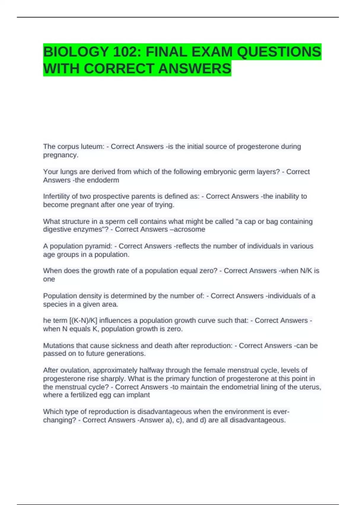 BIOLOGY 102 FINAL EXAM QUESTIONS WITH CORRECT ANSWERS