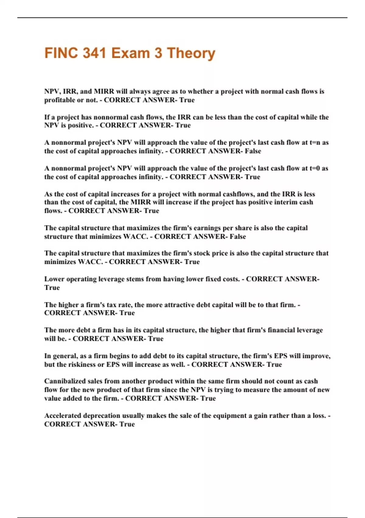 NPV, IRR, and MIRR will always agree as to whether a project with normal cash flows is profitable or not. - CORRECT ANSWER- True If a project has nonnormal cash flows, the IRR can be less than the cost of capital while the NPV is positive. - CORRECT ANSWER- True A nonnormal project's NPV will approach the value of the project's last cash flow at t=n as the cost of capital approaches infinity. - CORRECT ANSWER- False A nonnormal project's NPV will approach the value of the project's last cash flow at t=0 as the cost of capital approaches infinity. - CORRECT ANSWER- True As the cost of capital increases for a project with normal cashflows, and the IRR is less than the cost of capital, the MIRR will increase if the project has positive interim cash flows. - CORRECT ANSWER- True The capital structure that maximizes the firm's earnings per share is also the capital structure that minimizes WACC. - CORRECT ANSWER- False