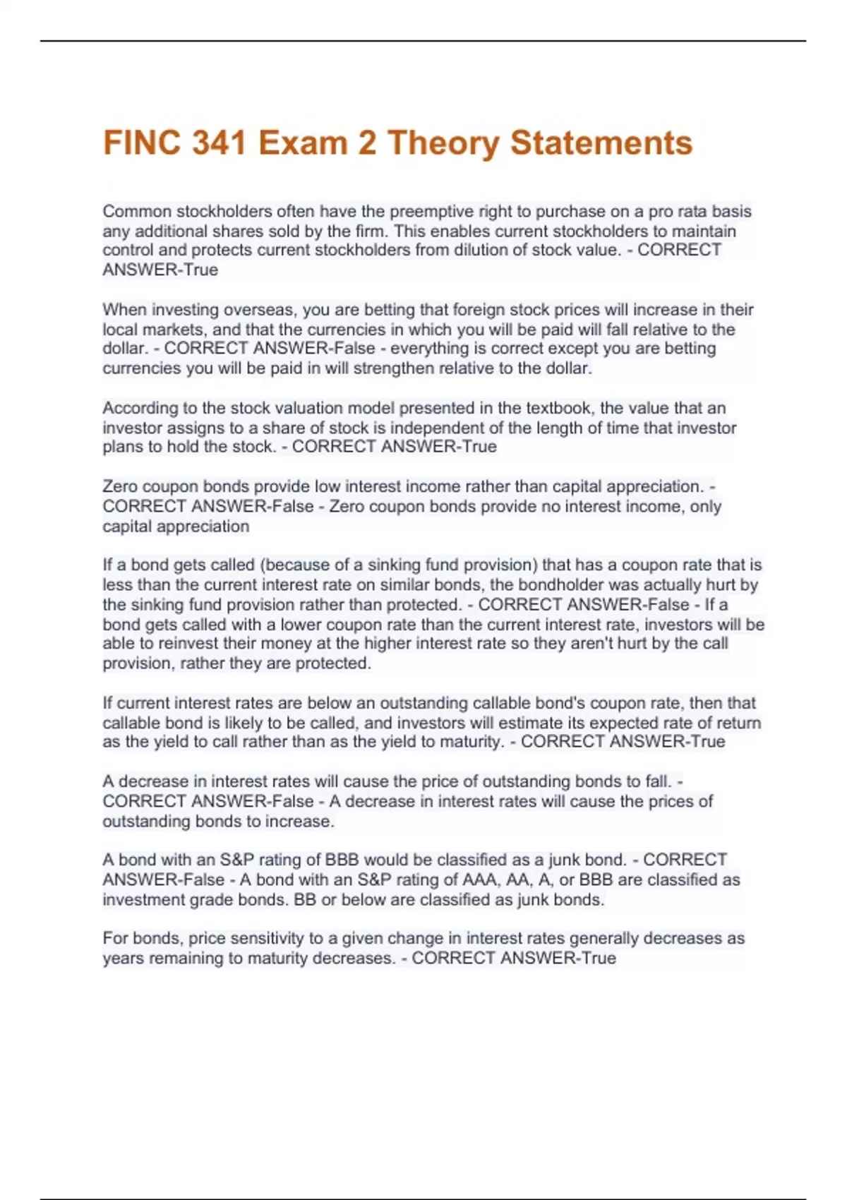 Common stockholders often have the preemptive right to purchase on a pro rata basis any additional shares sold by the firm. This enables current stockholders to maintain control and protects current stockholders from dilution of stock value. - CORRECT ANSWER-True When investing overseas, you are betting that foreign stock prices will increase in their local markets, and that the currencies in which you will be paid will fall relative to the dollar. - CORRECT ANSWER-False - everything is correct except you are betting currencies you will be paid in will strengthen relative to the dollar. According to the stock valuation model presented in the textbook, the value that an investor assigns to a share of stock is independent of the length of time that investor plans to hold the stock. - CORRECT ANSWER-True Zero coupon bonds provide low interest income rather than capital appreciation. - CORRECT ANSWER-False - Zero coupon bonds provide no interest income, only capital appreciation If a bond gets called (because of a sinking fund provision) that has a coupon rate that is less than the current interest rate on similar bonds, the bondholder was actually hurt by the sinking fund provision rather than protected. - CORRECT ANSWER-False - If a bond gets called with a lower coupon rate than the current interest rate, investors will be able to reinvest their money at the higher interest rate so they aren't hurt by the call provision, rather they are protected. If current interest rates are below an outstanding callable bond's coupon rate, then that callable bond is likely to be called, and investors will estimate its expected rate of return as the yield to call rather than as the yield to maturity. - CORRECT ANSWER-True A decrease in interest rates will cause the price of outstanding bonds to fall. - CORRECT ANSWER-False - A decrease in interest rates will cause the prices of outstanding bonds to increase. A bond with an S&P rating of BBB would be classified as a junk bond. - CORRECT ANSWER-False - A bond with an S&P rating of AAA, AA, A, or BBB are classified as investment grade bonds. BB or below are classified as junk bonds. For bonds, price sensitivity to a given change in interest rates generally decreases as years remaining to maturity decreases. - CORRECT ANSWER-TrueIgnoring interest accrued between payment dates, if the going rate of return on a bond is less than a bond's coupon interest rate, and kd remains below the coupon rate of that bond until maturity, then the market value of that bond will be above its par value until the bond matures, at which time its market value will equal its par value. - CORRECT ANSWER-True Assuming equal coupon rates, a 15-year original maturity bond with five years left to maturity has the same amount of interest rate risk as a 10-year original maturity bond with five years left to maturity. - CORRECT ANSWER-True
