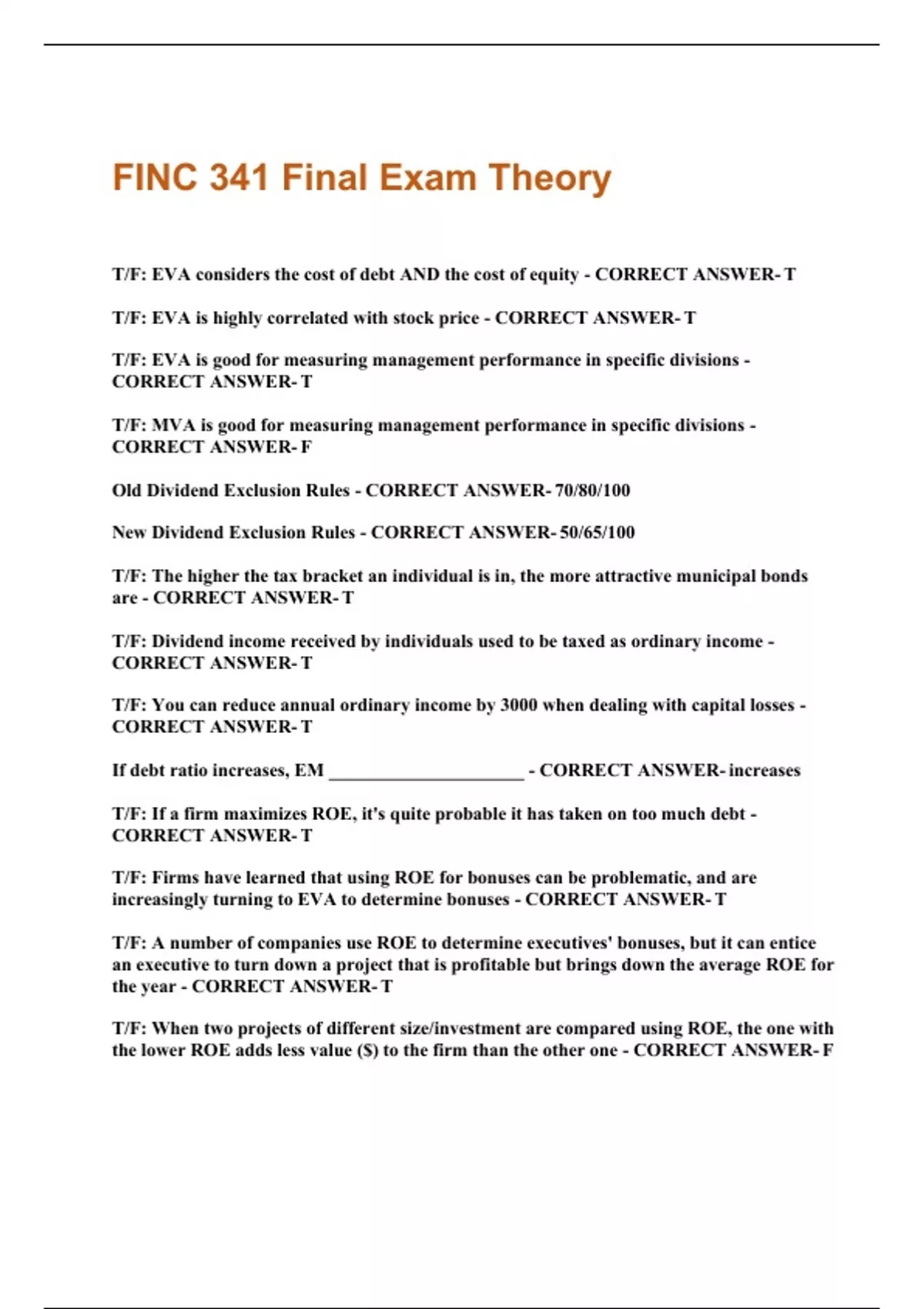 T/F: EVA considers the cost of debt AND the cost of equity - CORRECT ANSWER- T T/F: EVA is highly correlated with stock price - CORRECT ANSWER- T T/F: EVA is good for measuring management performance in specific divisions - CORRECT ANSWER- T T/F: MVA is good for measuring management performance in specific divisions - CORRECT ANSWER- F Old Dividend Exclusion Rules - CORRECT ANSWER- 70/80/100 New Dividend Exclusion Rules - CORRECT ANSWER- 50/65/100 T/F: The higher the tax bracket an individual is in, the more attractive municipal bonds are - CORRECT ANSWER- T T/F: Dividend income received by individuals used to be taxed as ordinary income - CORRECT ANSWER- T T/F: You can reduce annual ordinary income by 3000 when dealing with capital losses - CORRECT ANSWER- T If debt ratio increases, EM _____________________ - CORRECT ANSWER- increases T/F: If a firm maximizes ROE, it's quite probable it has taken on too much debt - CORRECT ANSWER- T T/F: Firms have learned that using ROE for bonuses can be problematic, and are increasingly turning to EVA to determine bonuses - CORRECT ANSWER- T