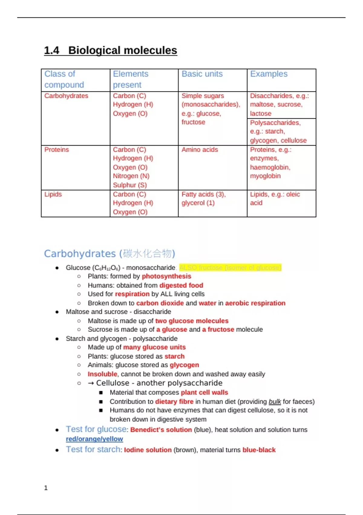 Chapter 1.4 Biological molecules - Summary Edexcel International GCSE Biology Student Book Second Edition - Biology