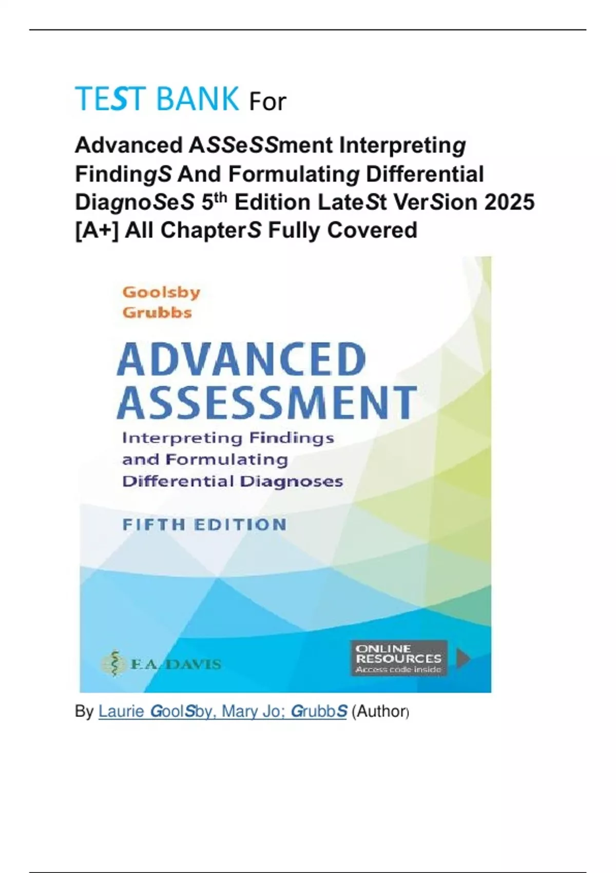TEST BANK For Advanced Assessment Interpreting Finding's And Formulating Differential Diagnoses 5th Edition Latest Version 2025 [A+] All Chapters Fully Covered by Laurie Goolsby, Mary Jo; Grubb (Author)