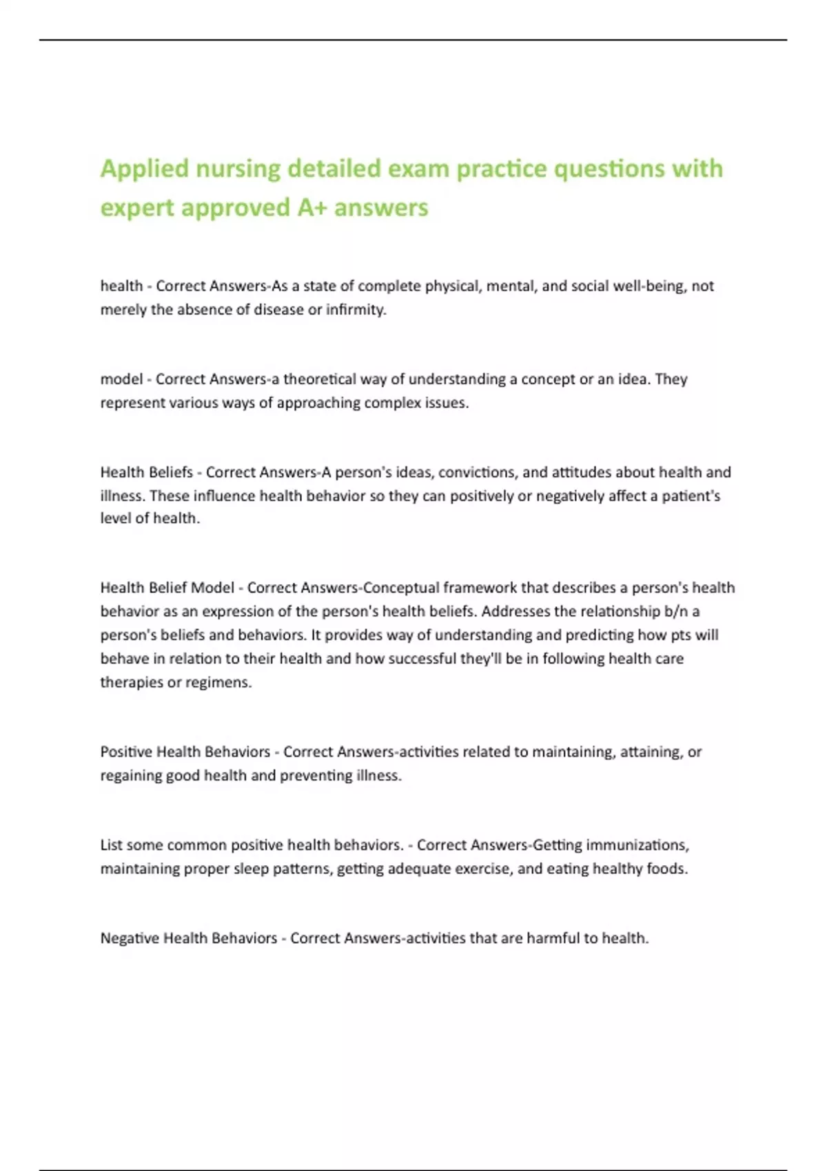 Health Beliefs - Correct Answers-A person's ideas, convictions, and attitudes about health and