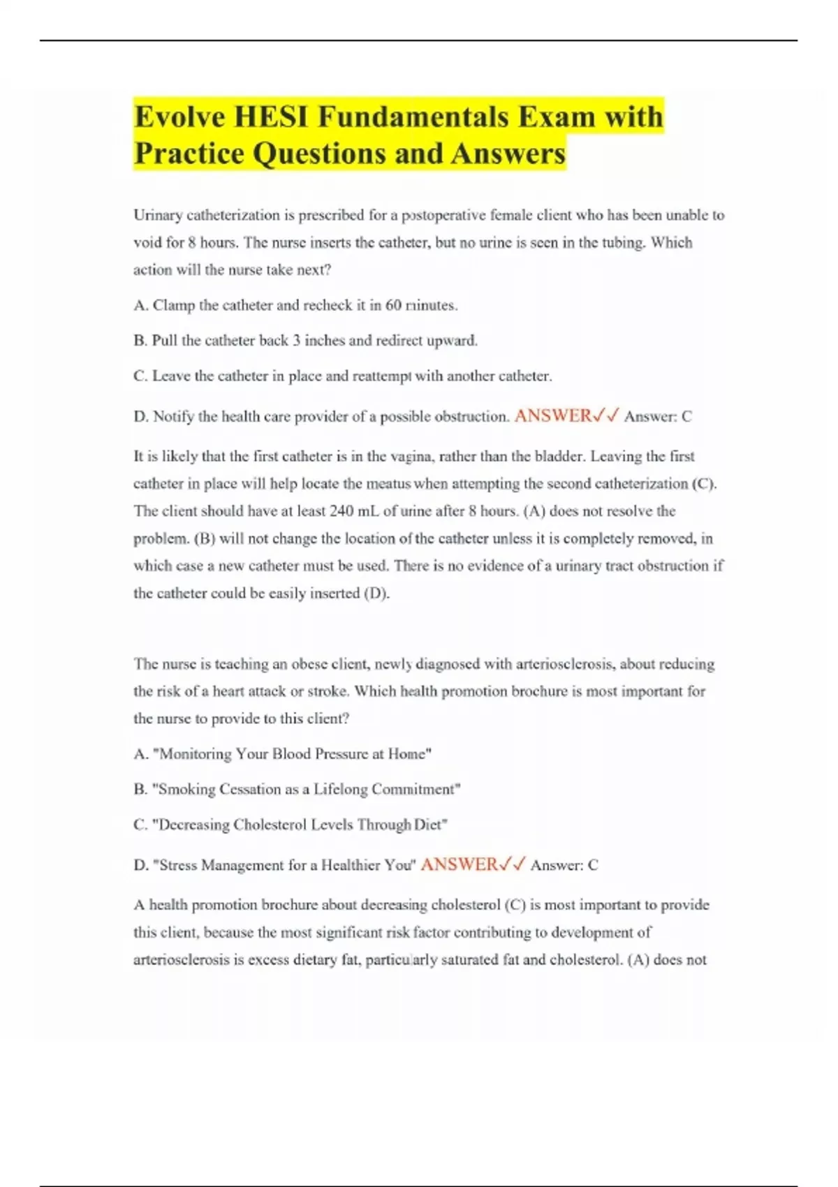 Evolve HESI Fundamentals Exam with Practice Questions and Answers Urinary catheterization is prescribed for a postoperative female client who has been unable to void for 8 hours. The nurse inserts the catheter, but no urine is seen in the tubing. Which action will the nurse take next? A. Clamp the catheter and recheck it in 60 minutes. B. Pull the catheter back 3 inches and redirect upward. C. Leave the catheter in place and reattempt with another catheter. D. Notify the health care provider of a possible obstruction. ANSWER Answer: C It is likely that the first catheter is in the vagina, rather than the bladder. Leaving the first catheter in place will help locate the meatus when attempting the second catheterization (C). The client should have at least 240 mL of urine after 8 hours. (A) does not resolve the problem. (B) will not change the location of the catheter unless it is completely removed, in which case a new catheter must be used. There is no evidence of a urinary tract obstruction if the catheter could be easily inserted (D). The nurse is teaching an obese client, newly diagnosed with arteriosclerosis, about reducing the risk of a heart attack or stroke. Which health promotion brochure is most important for the nurse to provide to this client? A. "Monitoring Your Blood Pressure at Home" B. "Smoking Cessation as a Lifelong Commitment" C. "Decreasing Cholesterol Levels Through Diet" D. "Stress Management for a Healthier You" ANSWER Answer: C A health promotion brochure about decreasing cholesterol (C) is most important to provide this client, because the most significant risk factor contributing to development of arteriosclerosis is excess dietary fat, particularly saturated fat and cholesterol. (A) does not
