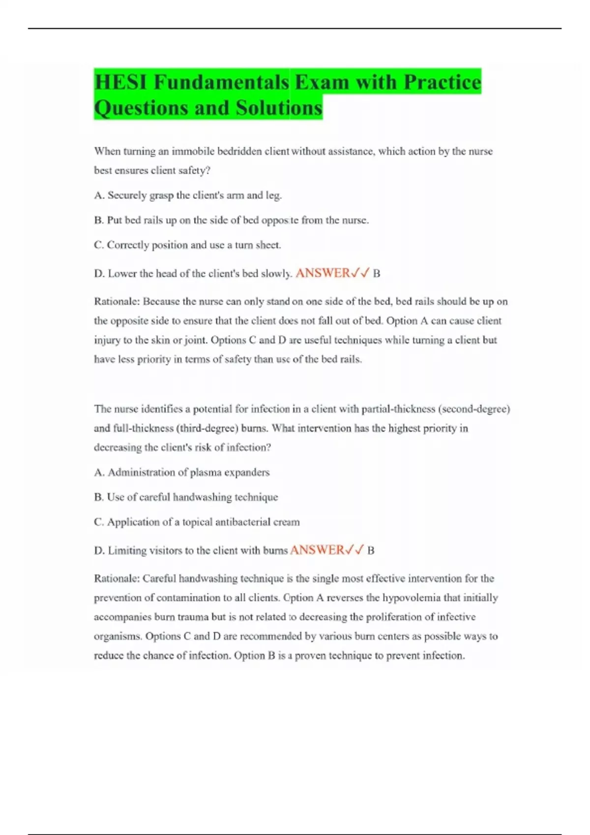 HESI Fundamentals Exam with Practice Questions and Solutions When turning an immobile bedridden client without assistance, which action by the nurse best ensures client safety? A. Securely grasp the client's arm and leg. B. Put bed rails up on the side of bed opposite from the nurse. C. Correctly position and use a turn sheet. D. Lower the head of the client's bed slowly. ANSWER B Rationale: Because the nurse can only stand on one side of the bed, bed rails should be up on the opposite side to ensure that the client does not fall out of bed. Option A can cause client injury to the skin or joint. Options C and D are useful techniques while turning a client but have less priority in terms of safety than use of the bed rails. The nurse identifies a potential for infection in a client with partial-thickness (second-degree) and full-thickness (third-degree) burns. What intervention has the highest priority in decreasing the client's risk of infection? A. Administration of plasma expanders B. Use of careful handwashing technique C. Application of a topical antibacterial cream D. Limiting visitors to the client with burns ANSWER B Rationale: Careful handwashing technique is the single most effective intervention for the prevention of contamination to all clients. Option A reverses the hypovolemia that initially accompanies burn trauma but is not related to decreasing the proliferation of infective organisms. Options C and D are recommended by various burn centers as possible ways to reduce the chance of infection. Option B is a proven technique to prevent infection.