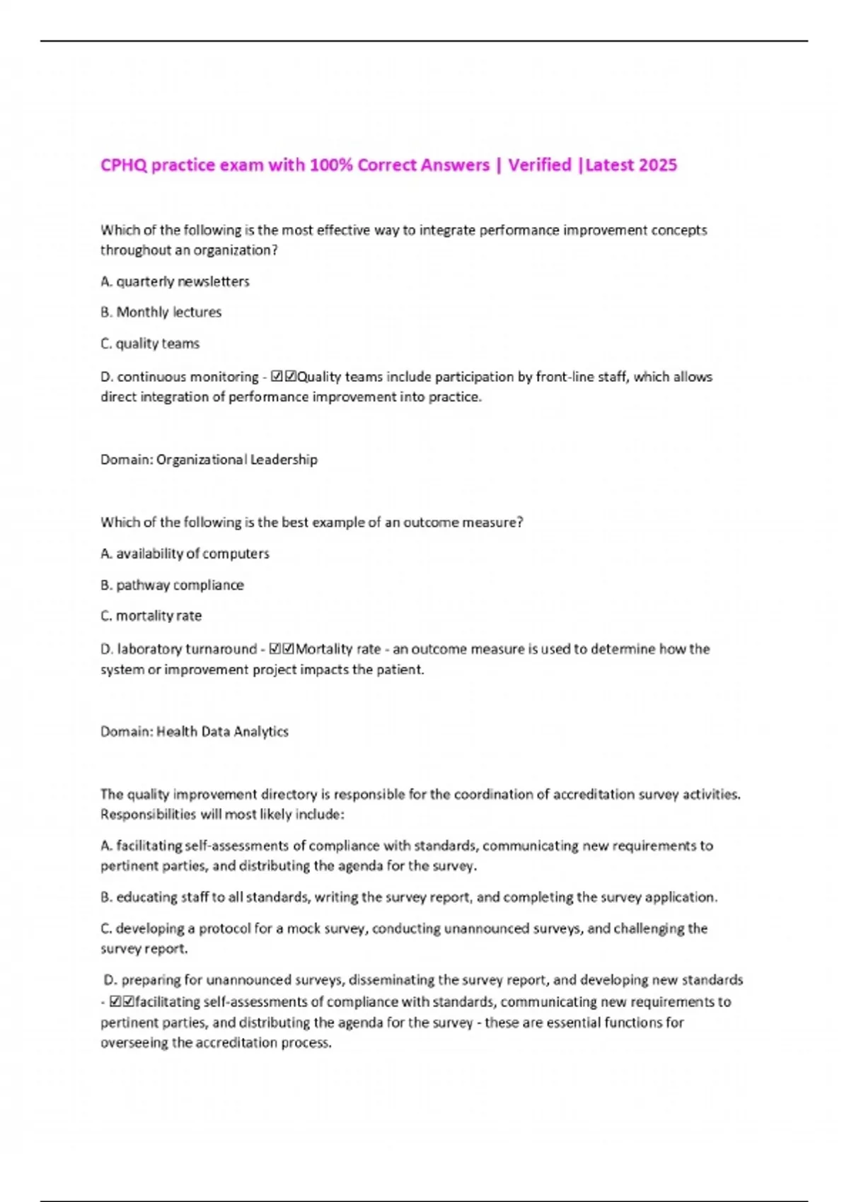 Package deal::: CPHQ Exams with 100% Correct Answers | Verified |Latest 2025/2026