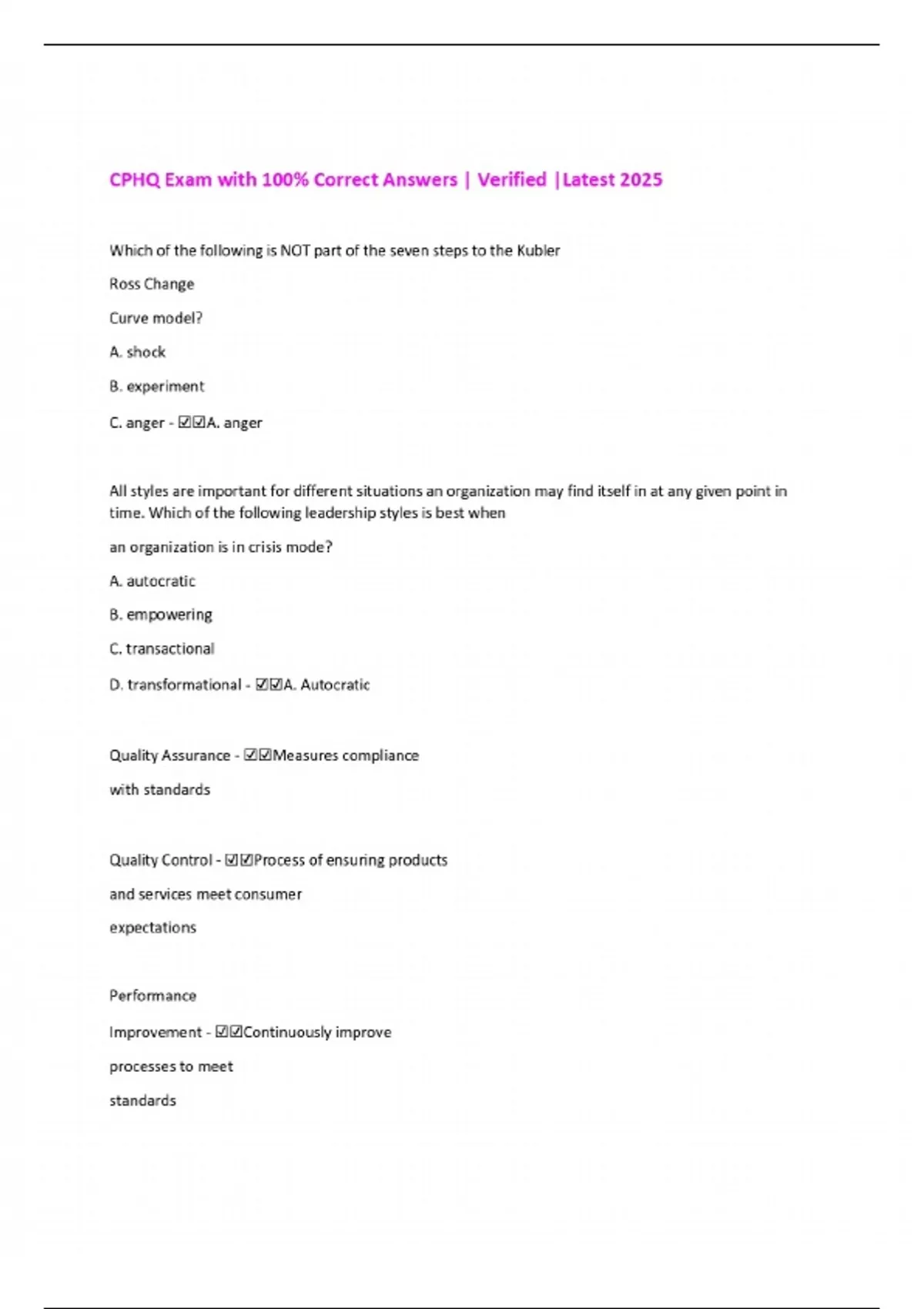 Package deal::: CPHQ Exams with 100% Correct Answers | Verified |Latest 2025/2026