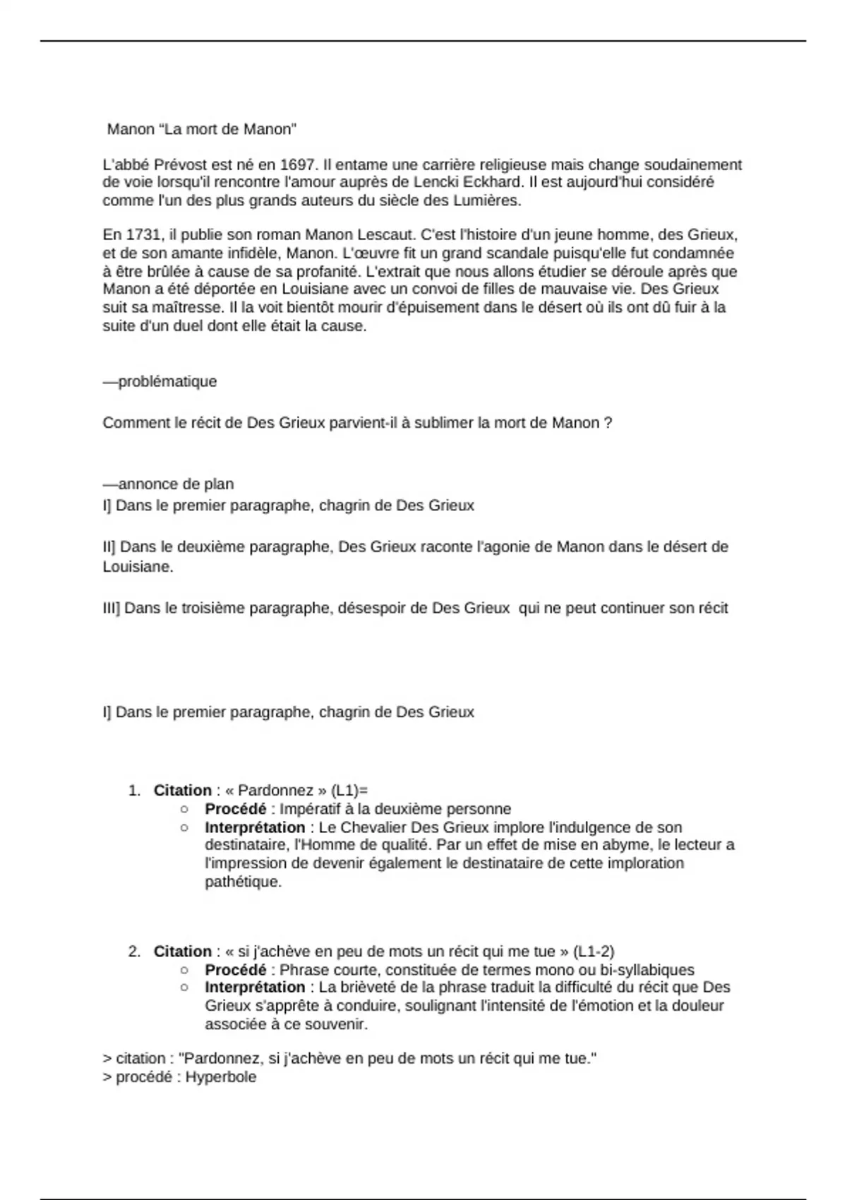 Résumé Fiche oral bac de français - Manon Lescaut : La mort de Manon