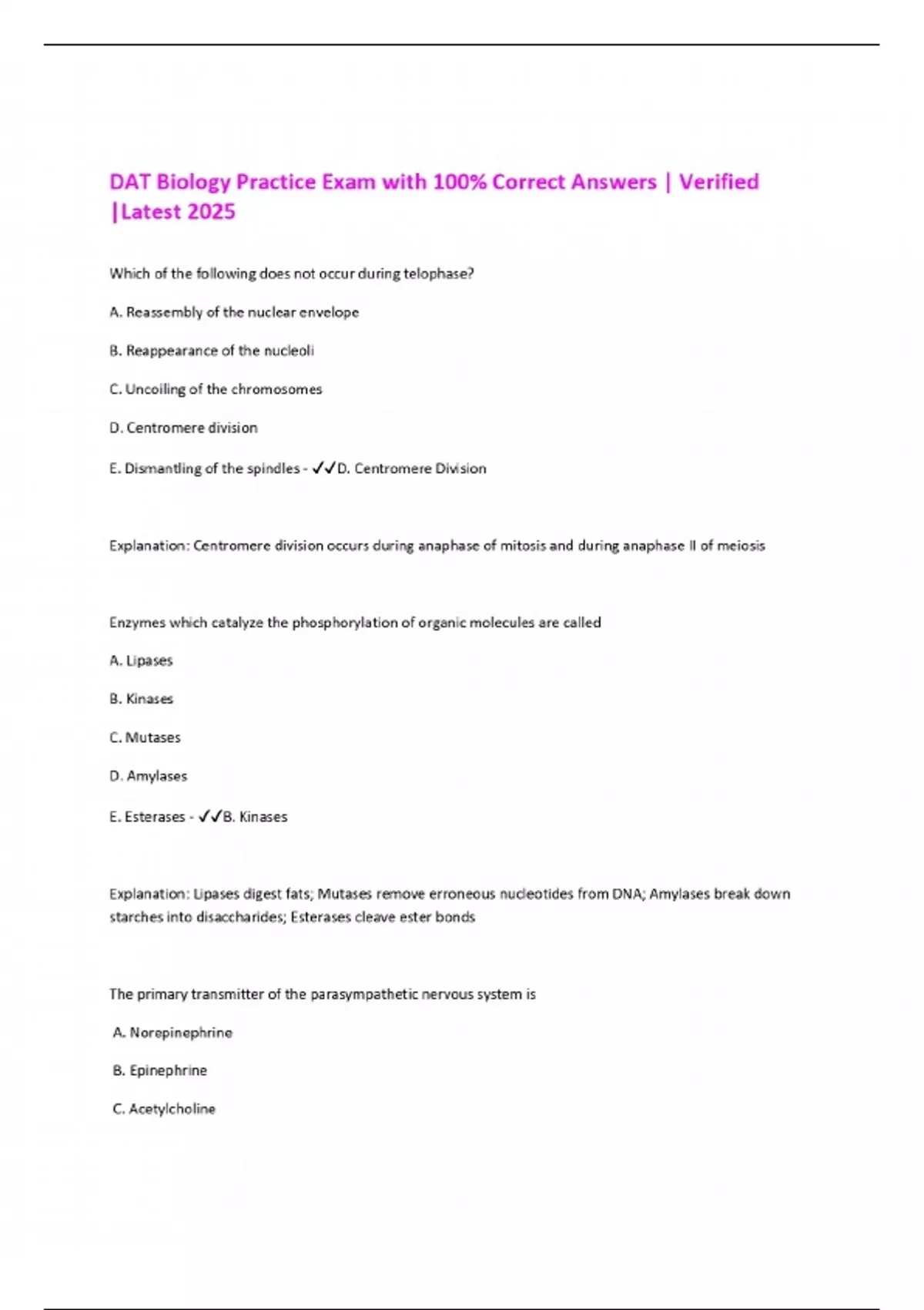 Package deal::: DAT Biology Exams with 100% Correct Answers | Verified |Latest 2025/2026