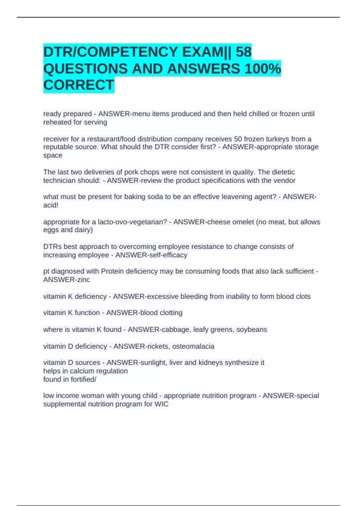 DTR/COMPETENCY EXAM|| 58 QUESTIONS AND ANSWERS 100% CORRECTDTR/COMPETENCY EXAM|| 58 QUESTIONS AND ANSWERS 100% CORRECTDTR/COMPETENCY EXAM|| 58 QUESTIONS AND ANSWERS 100% CORRECT ready prepared - ANSWER-menu items produced and then held chilled or frozen until reheated for serving receiver for a restaurant/food distribution company receives 50 frozen turkeys from a reputable source. What should the DTR consider first? - ANSWER-appropriate storage space The last two deliveries of pork chops were not consistent in quality. The dietetic technician should: - ANSWER-review the product specifications with the vendor what must be present for baking soda to be an effective leavening agent? - ANSWER-acid!