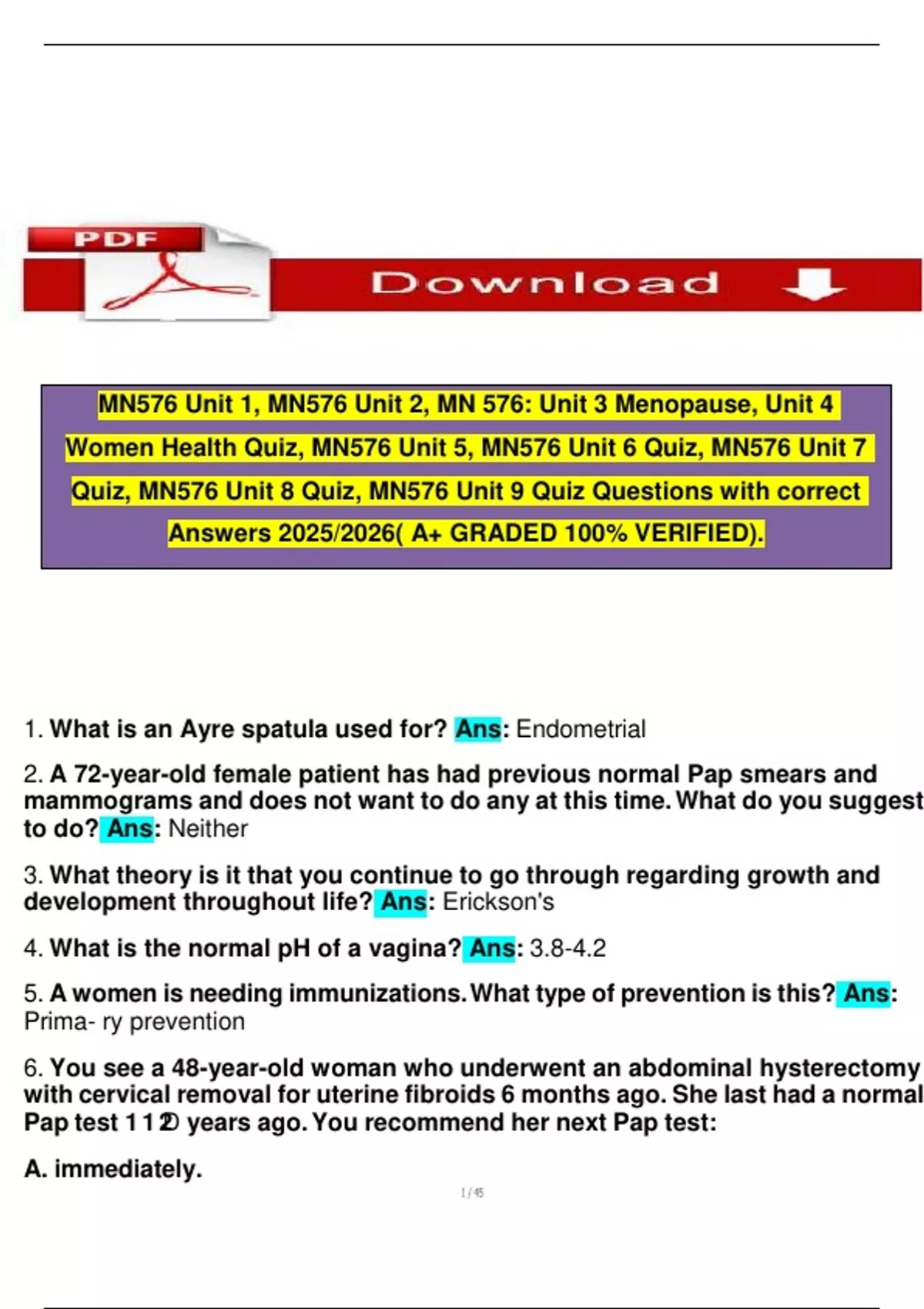 Women Health Quiz, MN576 Unit 5, MN576 Unit 6 Quiz, MN576 Unit 7