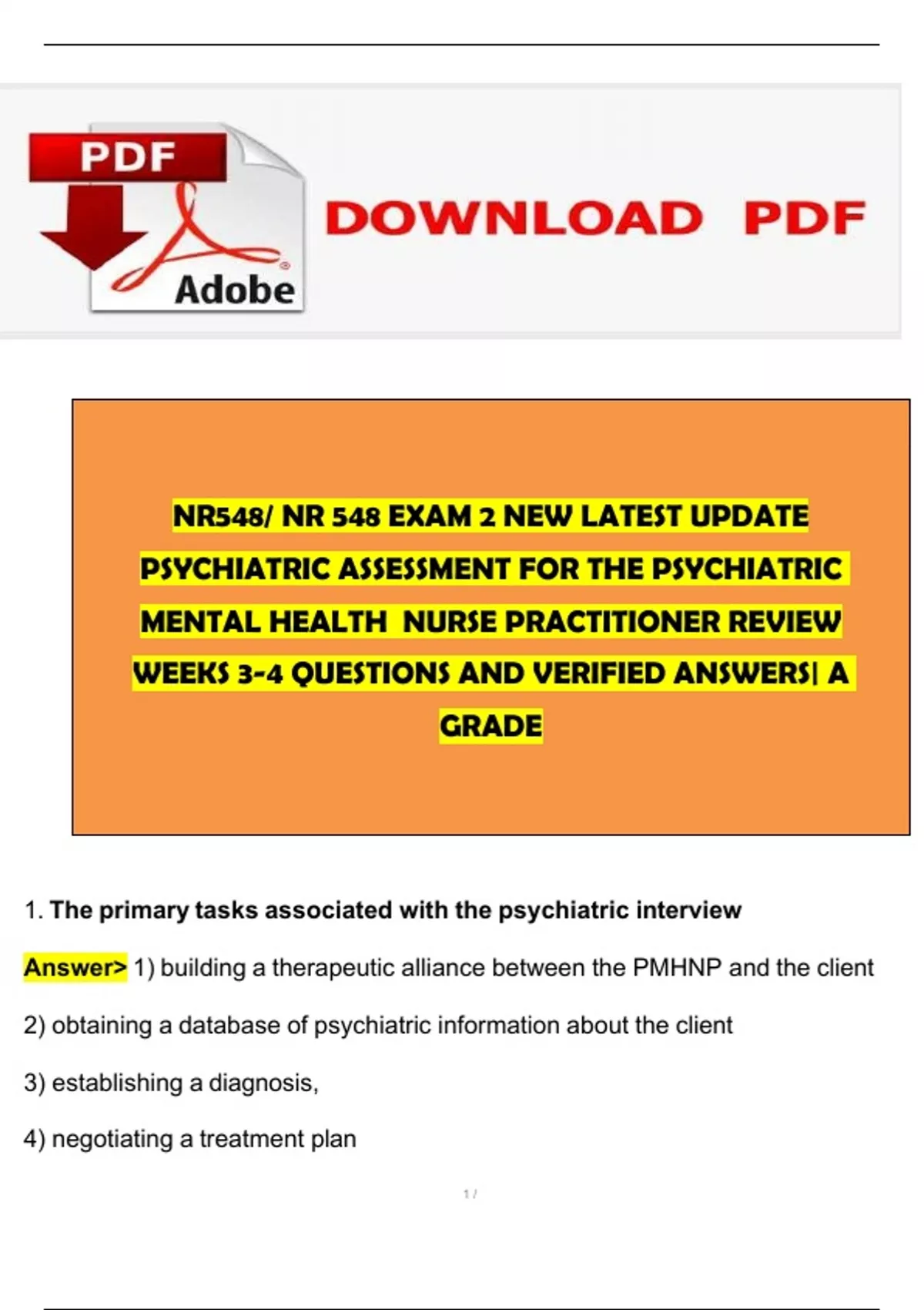NR548/ NR 548 EXAM 2 NEW LATEST UPDATE PSYCHIATRIC ASSESSMENT FOR THE PSYCHIATRIC MENTAL HEALTH NURSE PRACTITIONER REVIEW WEEKS 3-4 QUESTIONS AND VERIFIED ANSWERS| A GRADE 1. The primary tasks associated with the psychiatric interview Answer 1) building a therapeutic alliance between the PMHNP and the client 2) obtaining a database of psychiatric information about the client 3) establishing a diagnosis, 4) negotiating a treatment plan 2. Establishing a therapeutic alliance with the client begins NR548/ NR 548 EXAM 2 NEW LATEST UPDATE PSYCHIATRIC ASSESSMENT FOR THE PSYCHIATRIC MENTAL HEALTH NURSE PRACTITIONER REVIEW WEEKS 3-4 QUESTIONS AND VERIFIED ANSWERS| A GRADE 1. The primary tasks associated with the psychiatric interview Answer 1) building a therapeutic alliance between the PMHNP and the client 2) obtaining a database of psychiatric information about the client 3) establishing a diagnosis, 4) negotiating a treatment plan 2. Establishing a therapeutic alliance with the client begins 1. The primary tasks associated with the psychiatric interview Answer 1) building a therapeutic alliance between the PMHNP and the client 2) obtaining a database of psychiatric information about the client 3) establishing a diagnosis, 4) negotiating a treatment plan 2. Establishing a therapeutic alliance with the client begins