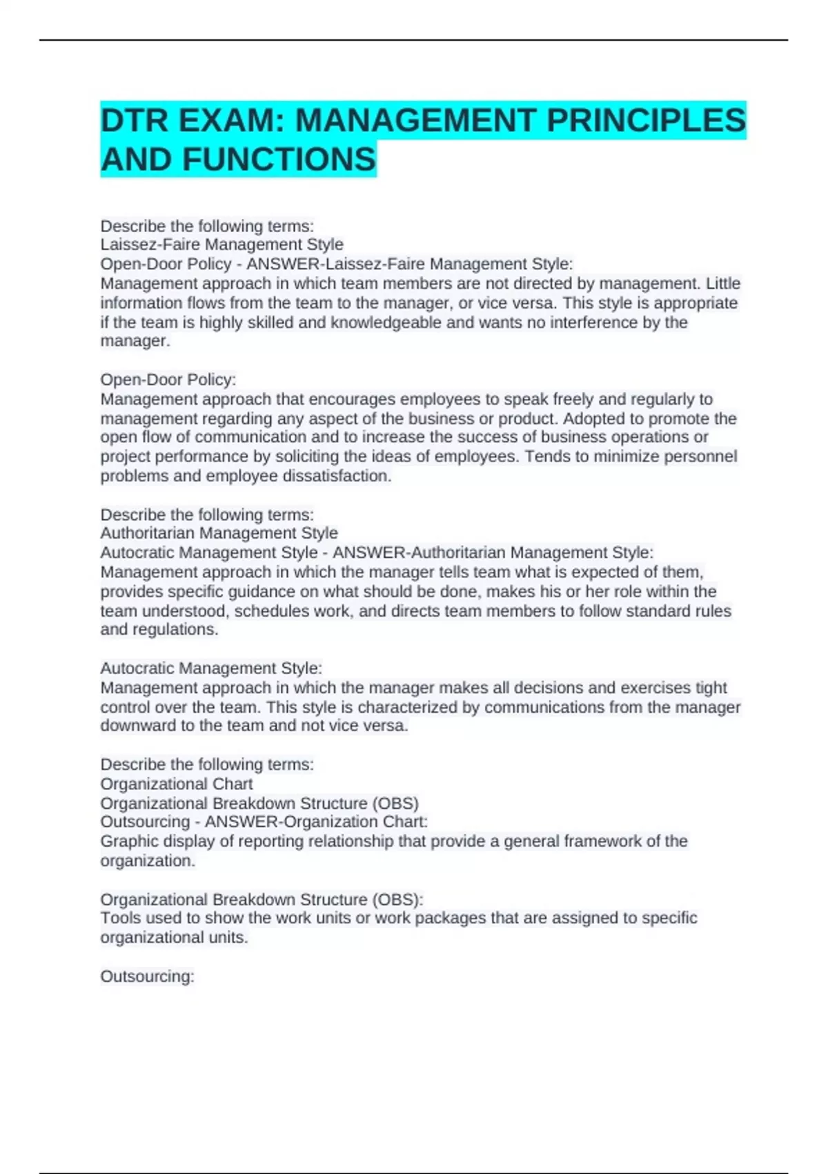 DTR EXAM: MANAGEMENT PRINCIPLES AND FUNCTIONSDTR EXAM: MANAGEMENT PRINCIPLES AND FUNCTIONSDTR EXAM: MANAGEMENT PRINCIPLES AND FUNCTIONSDescribe the following terms: Laissez-Faire Management Style Open-Door Policy - ANSWER-Laissez-Faire Management Style: Management approach in which team members are not directed by management. Little information flows from the team to the manager, or vice versa. This style is appropriate if the team is highly skilled and knowledgeable and wants no interference by the manager. Open-Door Policy: Management approach that encourages employees to speak freely and regularly to management regarding any aspect of the business or product. Adopted to promote the open flow of communication and to increase the success of business operations or