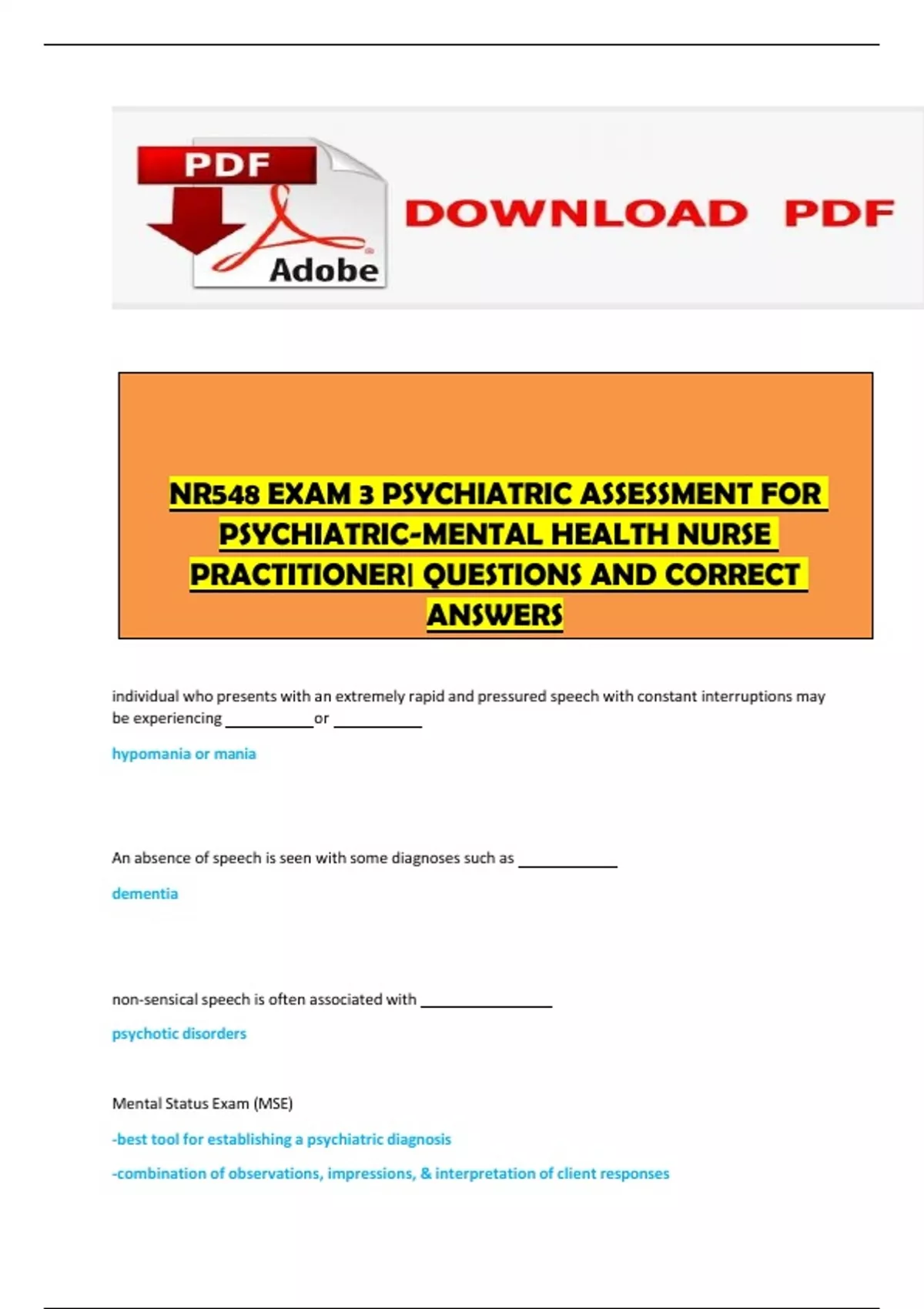 NR548 EXAM 3 PSYCHIATRIC ASSESSMENT FOR PSYCHIATRIC-MENTAL HEALTH NURSE PRACTITIONER| QUESTIONS AND CORRECT ANSWERS