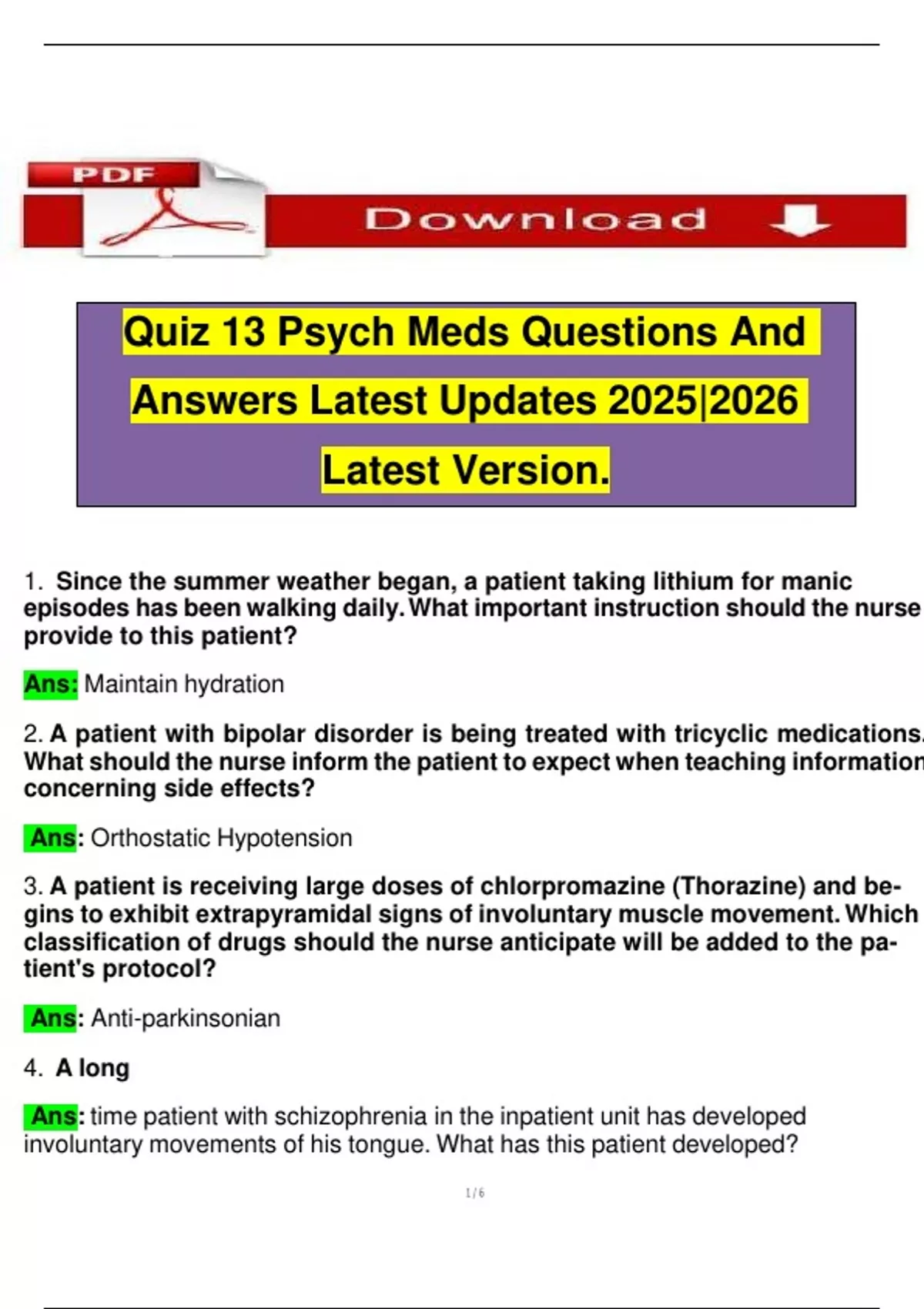 Quiz 13 Psych Meds Questions And Answers Latest Updates 2025|2026 Latest Version.