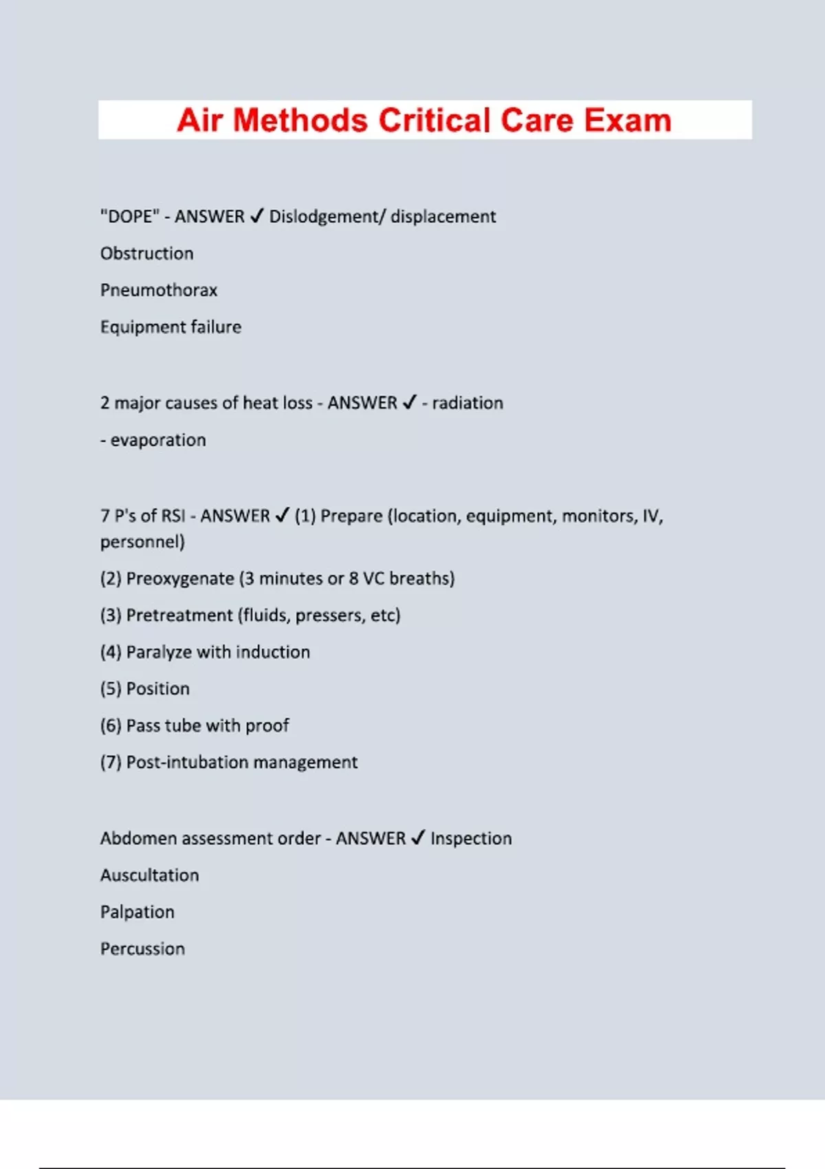 Air Methods Critical Care Exam Questions with 100% correct answers
