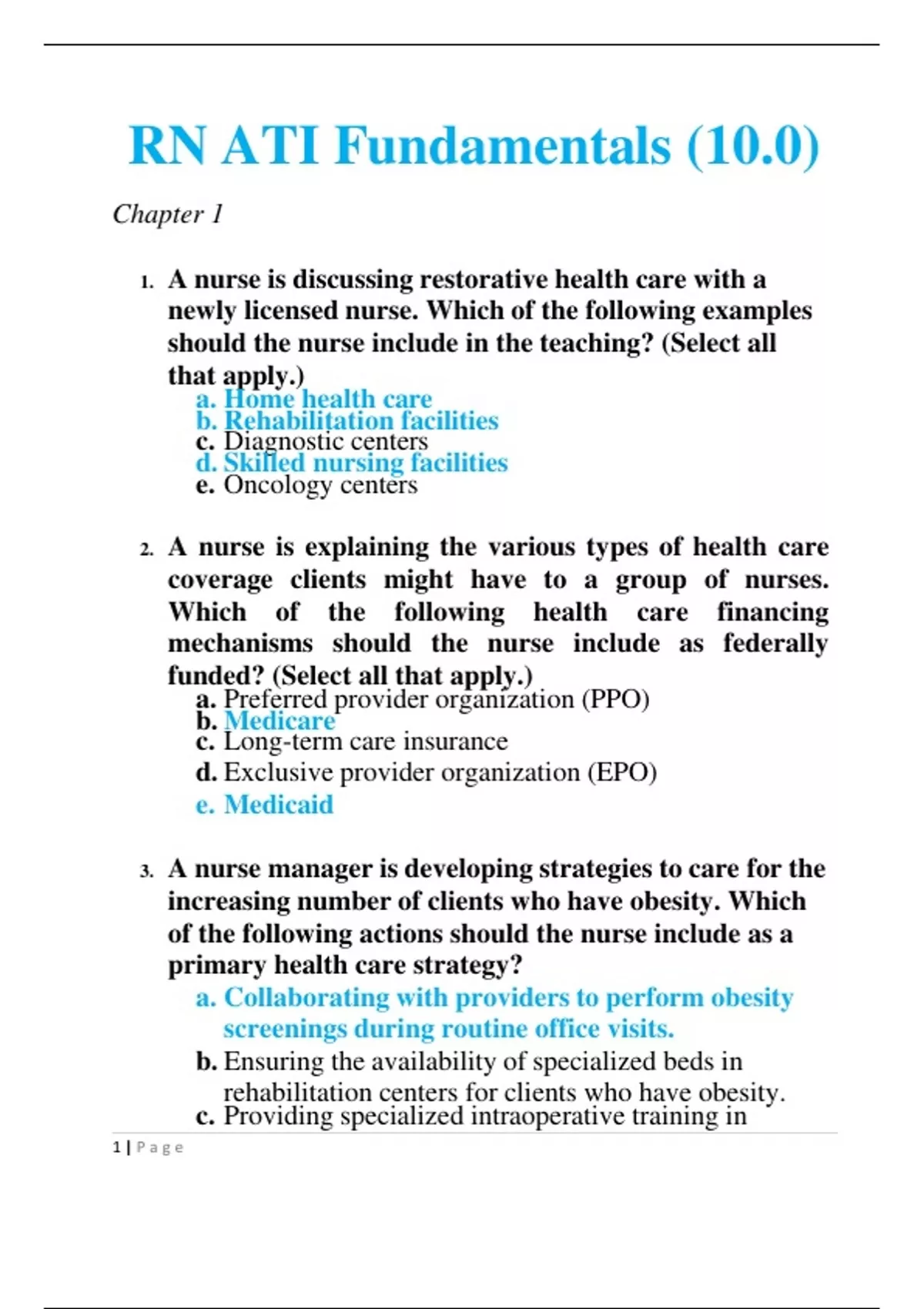 1. A nurse is discussing restorative health care with a