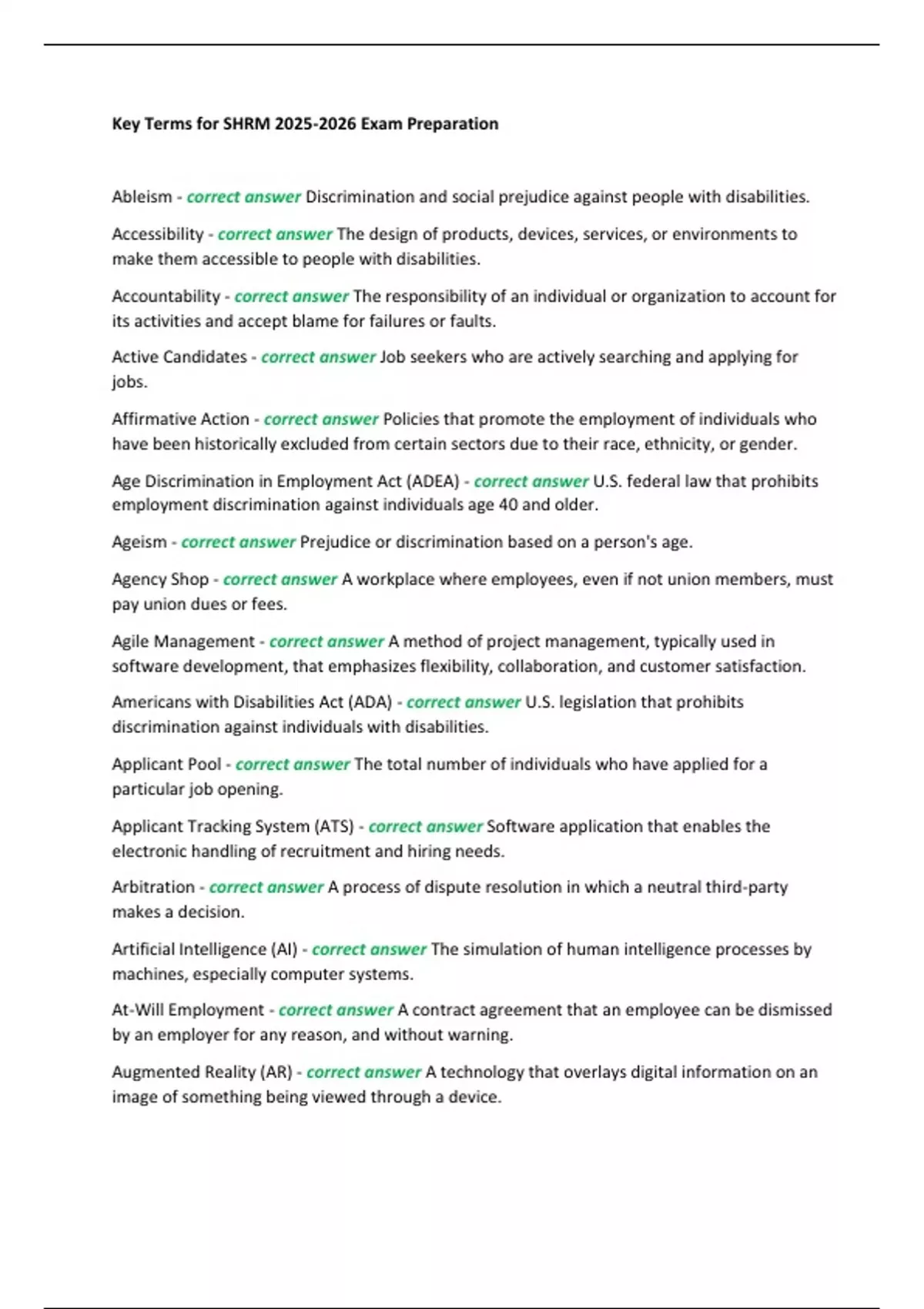 Americans with Disabilities Act (ADA) - correct answer U.S. legislation that prohibits
