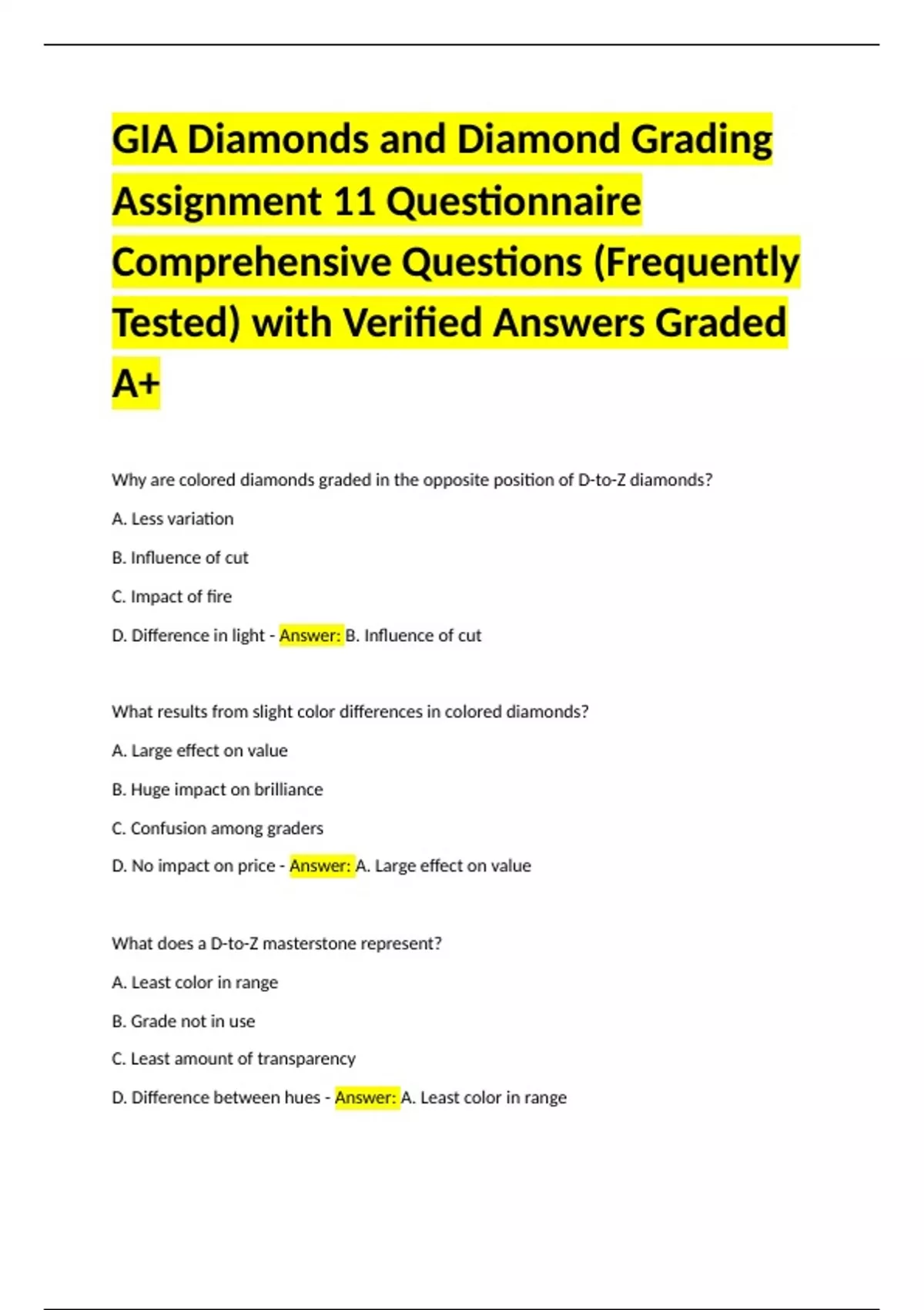 GIA Diamonds and Diamond Grading Assignment 11 Questionnaire Comprehensive Questions (Frequently Tested) with Verified Answers Graded A+