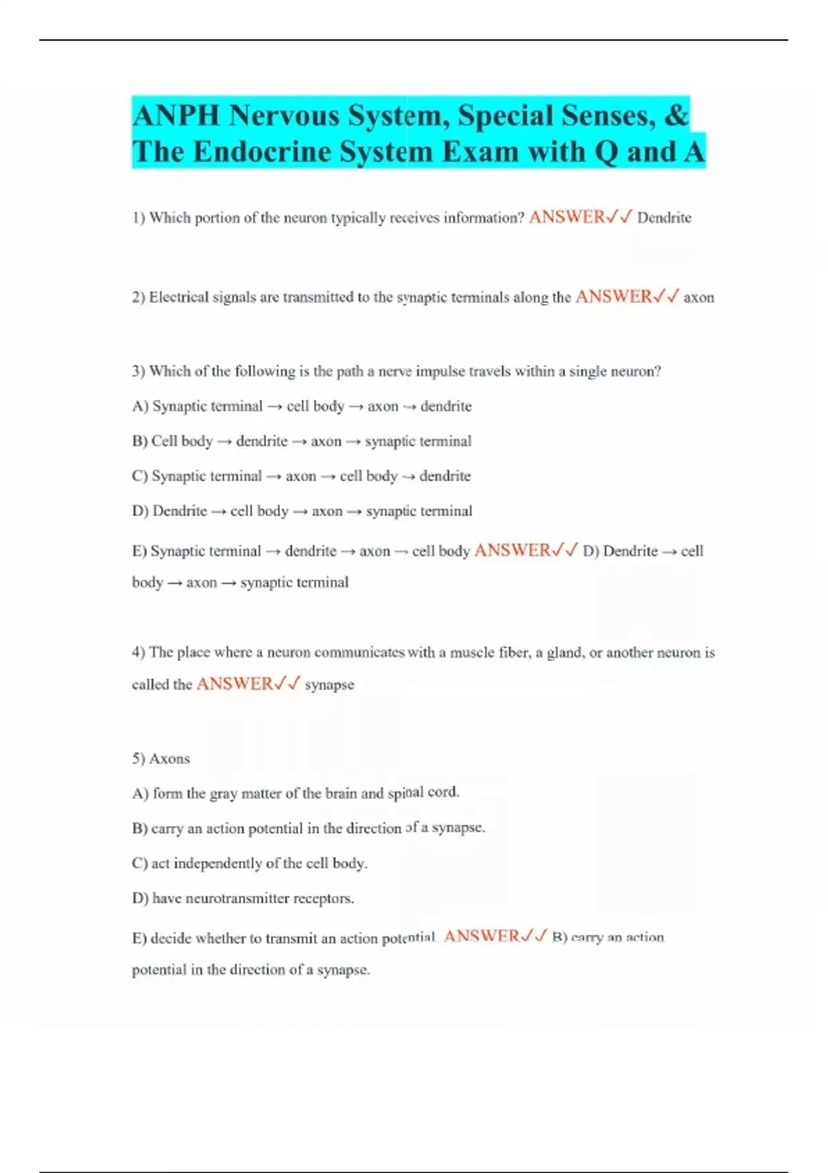 ANPH Nervous System, Special Senses, & The Endocrine System Exam with Q and A 1) Which portion of the neuron typically receives information? ANSWER Dendrite 2) Electrical signals are transmitted to the synaptic terminals along the ANSWER axon 3) Which of the following is the path a nerve impulse travels within a single neuron? A) Synaptic terminal → cell body → axon → dendrite B) Cell body → dendrite → axon → synaptic terminal C) Synaptic terminal → axon → cell body → dendrite D) Dendrite → cell body → axon → synaptic terminal E) Synaptic terminal → dendrite → axon → cell body ANSWER D) Dendrite → cell body → axon → synaptic terminal 4) The place where a neuron communicates with a muscle fiber, a gland, or another neuron is called the ANSWER synapse 5) Axons A) form the gray matter of the brain and spinal cord. B) carry an action potential in the direction of a synapse. C) act independently of the cell body. D) have neurotransmitter receptors. E) decide whether to transmit an action potential. ANSWER B) carry an action potential in the direction of a synapse.