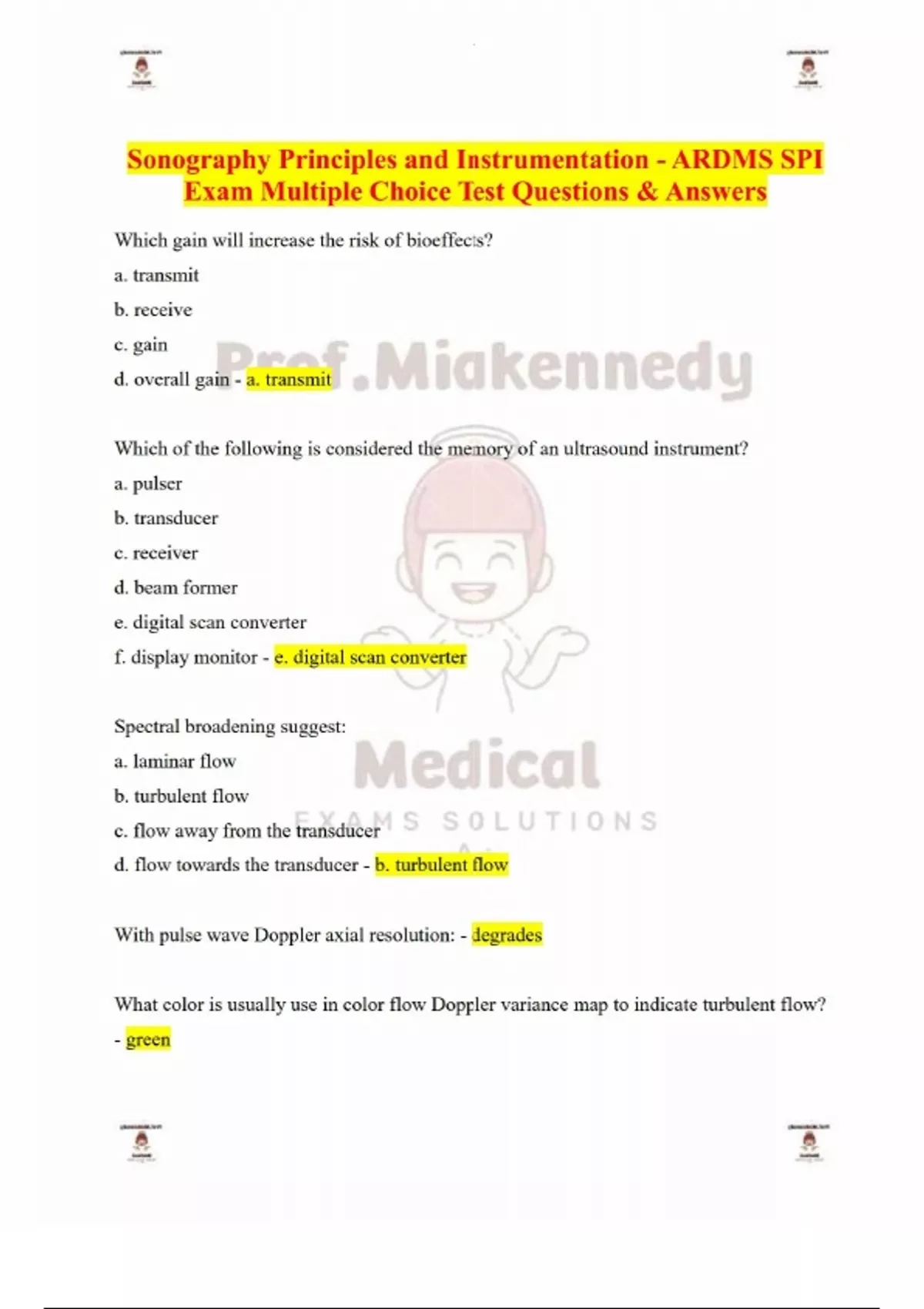 Sonography Principles and Instrumentation - ARDMS SPI Exam Multiple Choice Test Questions & Answers-Which gain will increase the risk of bioeffects? a. transmit b. receive c. gain d. overall gain - a. transmit Which of the following is considered the memory of an ultrasound instrument? a. pulser b. transducer c. receiver d. beam former e. digital scan converter f. display monitor - e. digital scan converter Spectral broadening suggest: a. laminar flow b. turbulent flow c. flow away from the transducer d. flow towards the transducer - b. turbulent flow With pulse wave Doppler axial resolution: - degrades What color is usually use in color flow Doppler variance map to indicate turbulent flow? - green Doppler high pass filter eliminates: - high amplitude signals; low velocity flow The Doppler wall filter is considered a: - high pass filter The Nyquist Limit is equal to: a. propagation speed x frequency b. propagation speed/ wavelength c. PRF/2 d. 4xV^2 - c. PRF/2 Multiple echoes, equally spaced originating from a gas bubble is called: a. comet tail b. ring down c. slice thickness artifact d. multipath - b. ring down An increase in red blood cell velocity will_____ the Doppler Shift: a. increase b. decrease c. not change d. cannot be predicted - a. increase