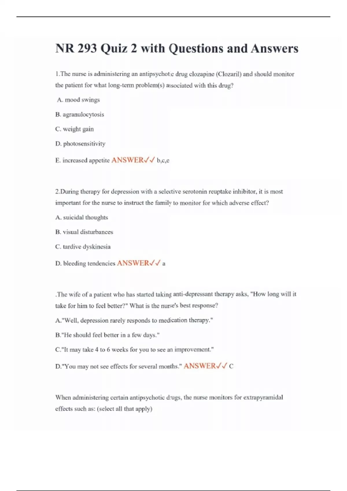 NR 293 Quiz 2 with Questions and Answers 1.The nurse is administering an antipsychotic drug clozapine (Clozaril) and should monitor the patient for what long-term problem(s) associated with this drug? A. mood swings B. agranulocytosis C. weight gain D. photosensitivity E. increased appetite ANSWER b,c,e 2.During therapy for depression with a selective serotonin reuptake inhibitor, it is most important for the nurse to instruct the family to monitor for which adverse effect? A. suicidal thoughts B. visual disturbances C. tardive dyskinesia D. bleeding tendencies ANSWER a .The wife of a patient who has started taking anti-depressant therapy asks, "How long will it take for him to feel better?" What is the nurse's best response? A."Well, depression rarely responds to medication therapy." B."He should feel better in a few days." C."It may take 4 to 6 weeks for you to see an improvement." D."You may not see effects for several months." ANSWER C When administering certain antipsychotic drugs, the nurse monitors for extrapyramidal effects such as: (select all that apply)