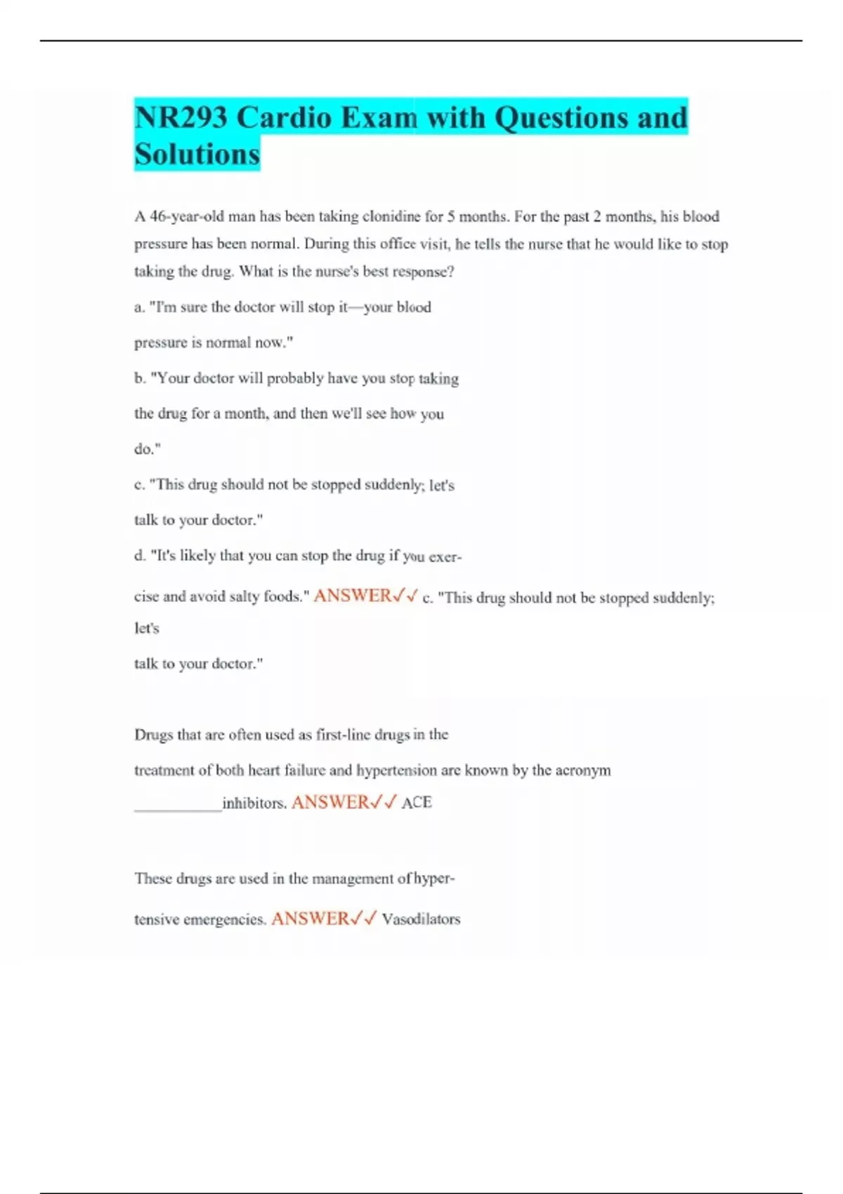 NR293 Cardio Exam with Questions and Solutions A 46-year-old man has been taking clonidine for 5 months. For the past 2 months, his blood pressure has been normal. During this office visit, he tells the nurse that he would like to stop taking the drug. What is the nurse's best response? a. "I'm sure the doctor will stop it—your blood pressure is normal now." b. "Your doctor will probably have you stop taking the drug for a month, and then we'll see how you do." c. "This drug should not be stopped suddenly; let's talk to your doctor." d. "It's likely that you can stop the drug if you exer- cise and avoid salty foods." ANSWER c. "This drug should not be stopped suddenly; let's talk to your doctor." Drugs that are often used as first-line drugs in the treatment of both heart failure and hypertension are known by the acronym ___________inhibitors. ANSWER ACE