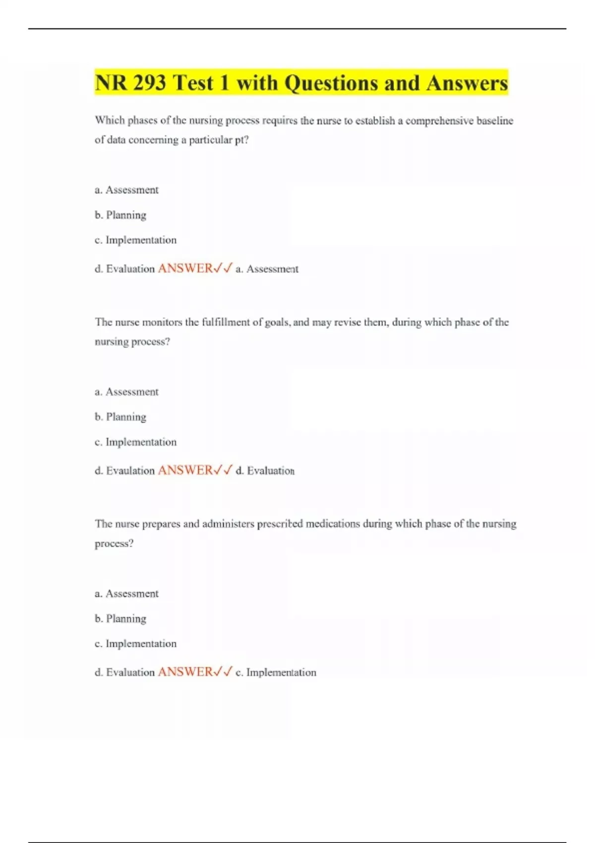 NR 293 Test 1 with Questions and Answers Which phases of the nursing process requires the nurse to establish a comprehensive baseline of data concerning a particular pt? a. Assessment b. Planning c. Implementation d. Evaluation ANSWER a. Assessment The nurse monitors the fulfillment of goals, and may revise them, during which phase of the nursing process? a. Assessment b. Planning c. Implementation d. Evaulation ANSWER d. Evaluation The nurse prepares and administers prescribed medications during which phase of the nursing process? a. Assessment b. Planning c. Implementation d. Evaluation ANSWER c. Implementation