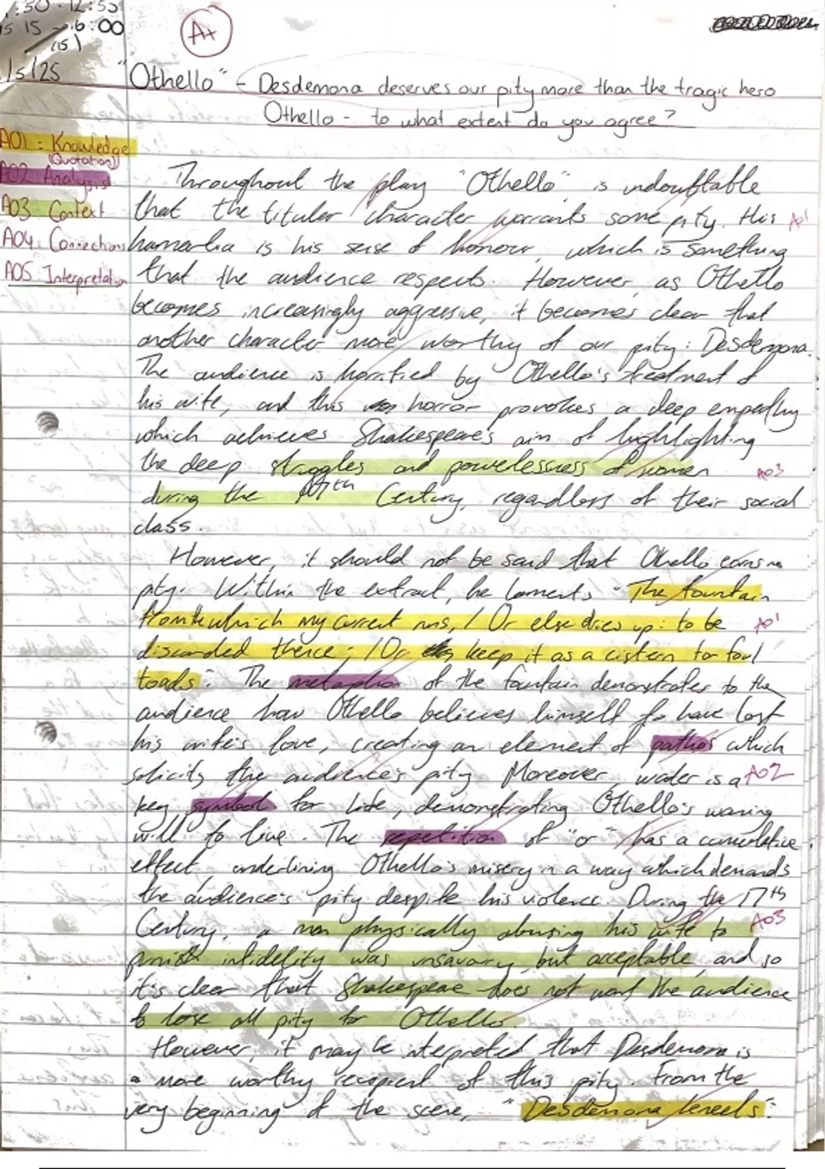 This is an A Level English Literature essay on Desdemona and Othello from "Othello" by William Shakespeare. This essay received an A+. I have annotated and colour coded this essay, and have included an essay plan. I hope this is useful!