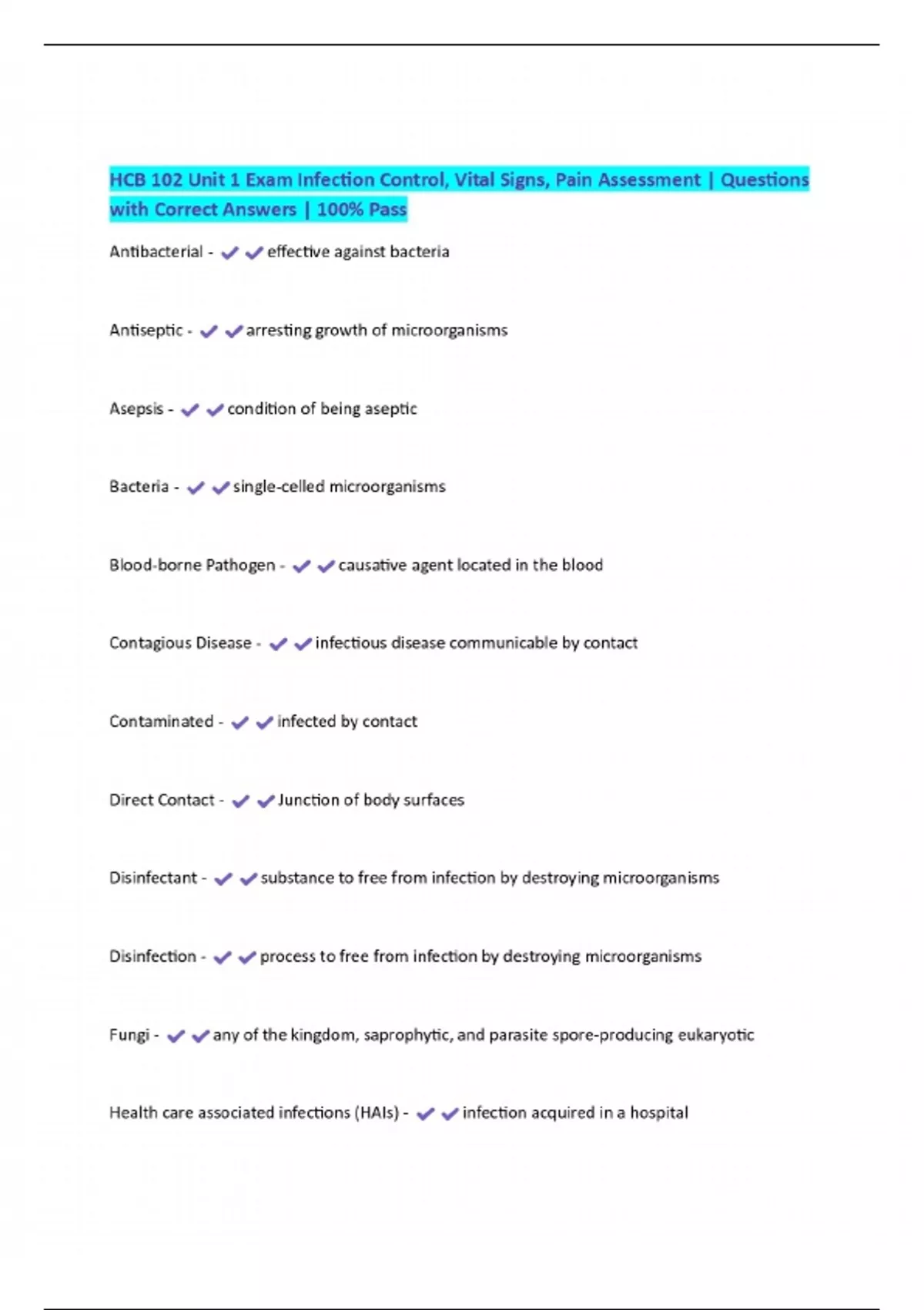 HCB 102 Unit 1 Exam Infection Control, Vital Signs, Pain Assessment | Questions with Correct Answers | 100% Pass